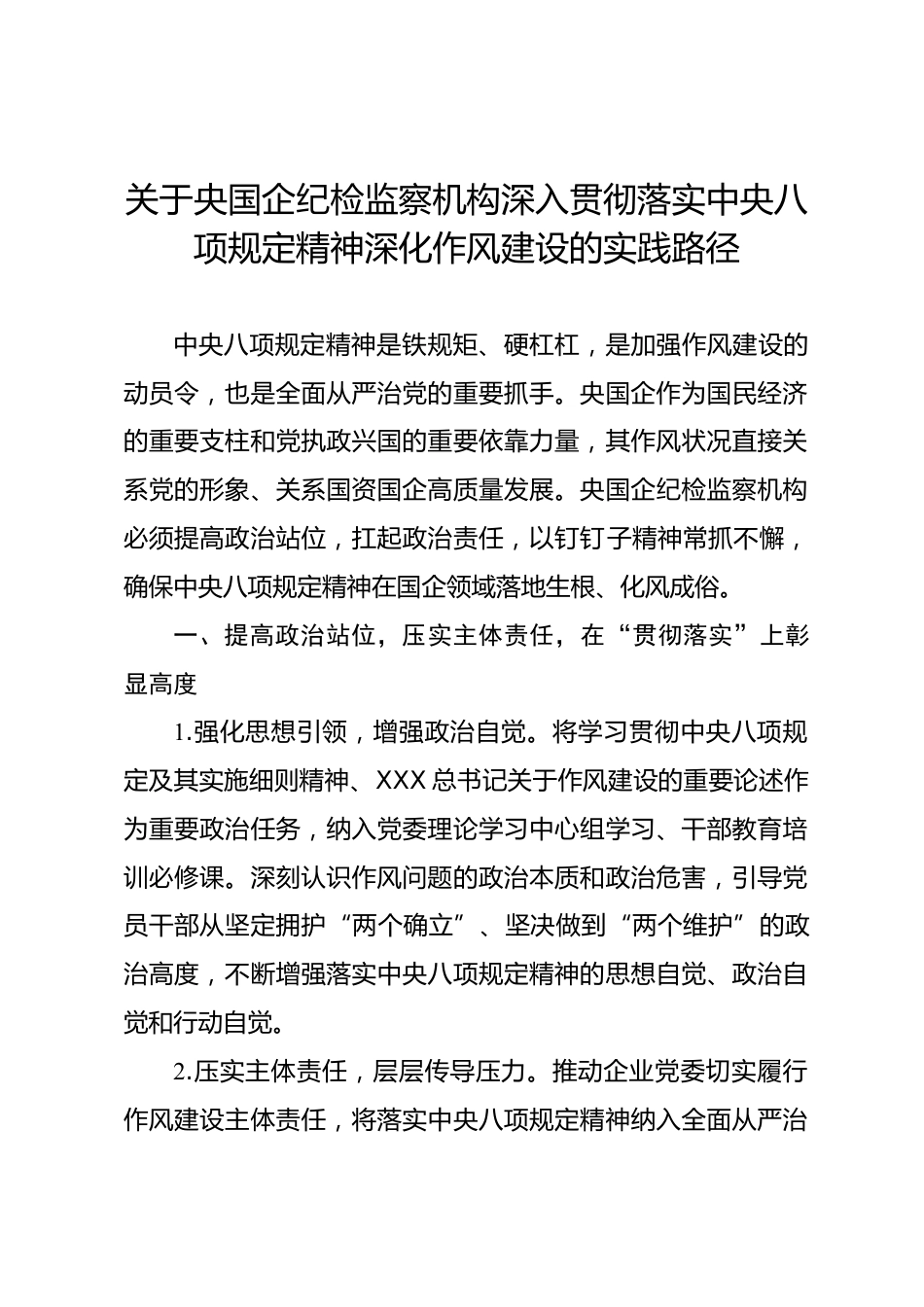 關(guān)于央國企紀(jì)檢監(jiān)察機(jī)構(gòu)深入貫徹落實中央八項規(guī)定精神深化作風(fēng)建設(shè)的實踐路徑中央八項規(guī)定精神是鐵規(guī)矩、硬杠杠,是加強(qiáng)作風(fēng)建設(shè)的動員令,也是全面從嚴(yán)治黨的重要抓手。央國企作為國民經(jīng)濟(jì)的重要支柱和黨執(zhí)政興國的重要依靠力量,其作風(fēng)狀況直接關(guān)系黨的形象、關(guān)系國資國企高質(zhì)量發(fā)展。央國企紀(jì)檢監(jiān)察機(jī)構(gòu)必須提高政治站位,扛起政治責(zé)任,以釘釘子精神常抓不懈,確保中央八項規(guī)定精神在國企領(lǐng)域落地生根、化風(fēng)成俗。一、提高政治站位,壓實主體責(zé)任,在“貫徹落實”上彰顯高度1.強(qiáng)化思想引領(lǐng),增強(qiáng)政治自覺。將學(xué)習(xí)貫徹中央八項規(guī)定及其實施細(xì)則精神、XXX總書記關(guān)于作...
