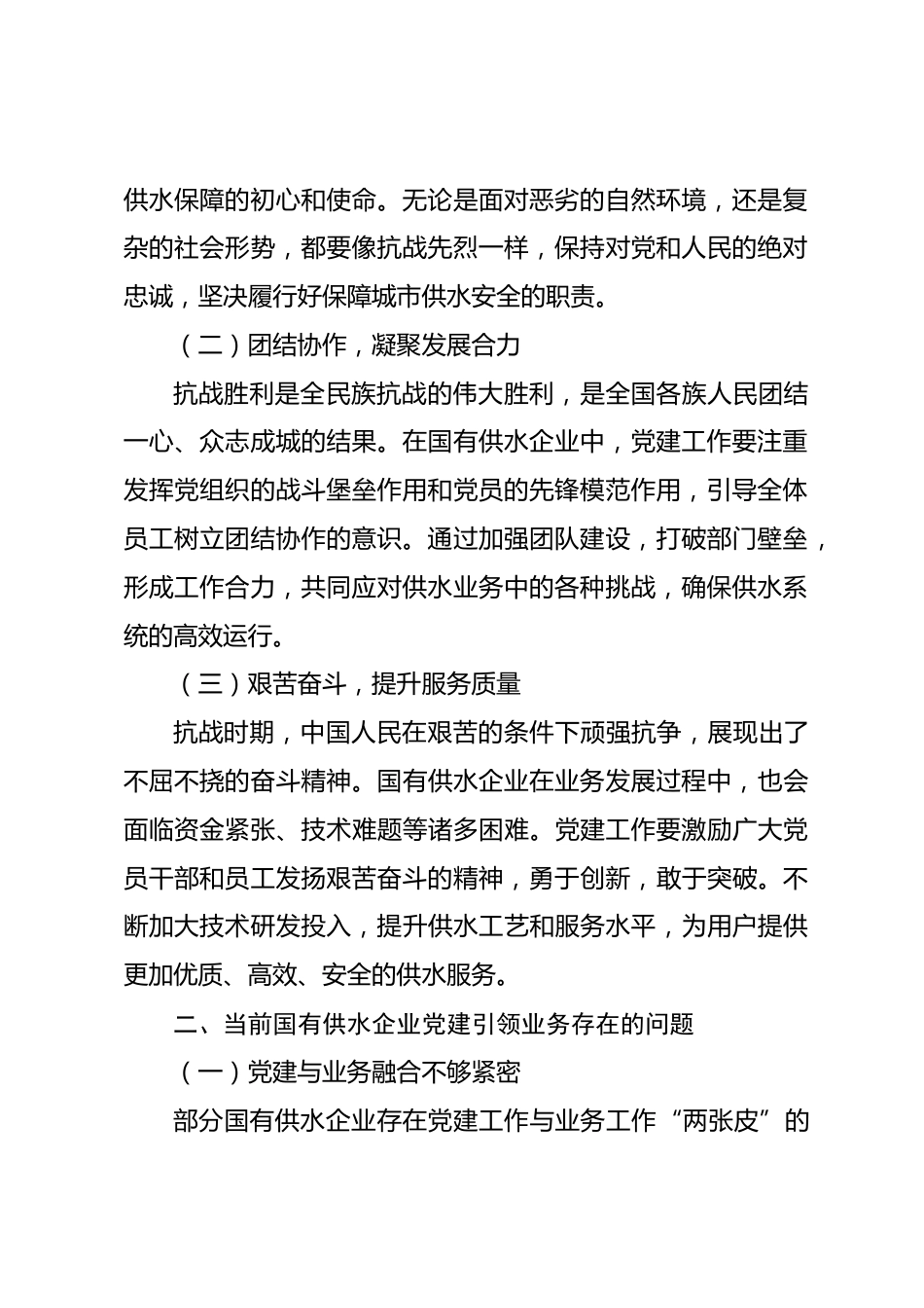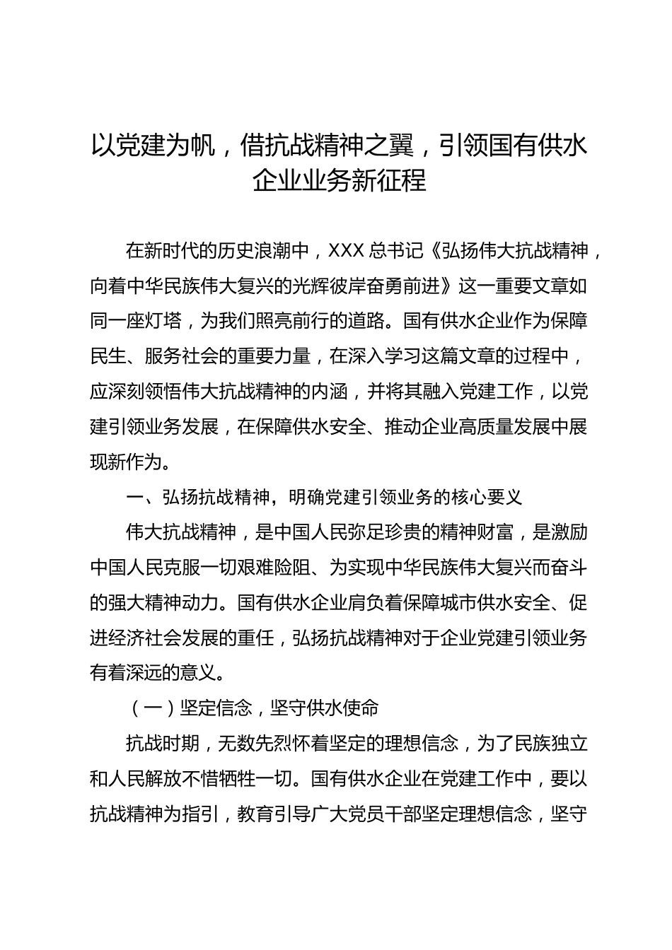 以黨建為帆,借抗戰(zhàn)精神之翼,引領(lǐng)國有供水企業(yè)業(yè)務(wù)新征程在新時代的歷史浪潮中,XXX總書記《弘揚偉大抗戰(zhàn)精神,向著中華民族偉大復(fù)興的光輝彼岸奮勇前進》這一重要文章如同一座燈塔,為我們照亮前行的道路。國有供水企業(yè)作為保障民生、服務(wù)社會的重要力量,在深入學(xué)習(xí)這篇文章的過程中,應(yīng)深刻領(lǐng)悟偉大抗戰(zhàn)精神的內(nèi)涵,并將其融入黨建工作,以黨建引領(lǐng)業(yè)務(wù)發(fā)展,在保障供水安全、推動企業(yè)高質(zhì)量發(fā)展中展現(xiàn)新作為。一、弘揚抗戰(zhàn)精神,明確黨建引領(lǐng)業(yè)務(wù)的核心要義偉大抗戰(zhàn)精神,是中國人民彌足珍貴的精神財富,是激勵中國人民克服一切艱難險阻、為實現(xiàn)中華民族偉大復(fù)興而...
