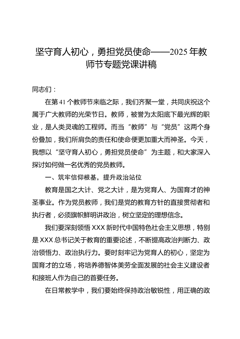 堅(jiān)守育人初心,勇?lián)h員使命——2025年教師節(jié)專題黨課講稿