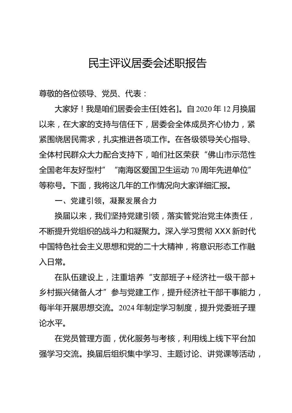 民主評議居委會述職報告尊敬的各位領(lǐng)導(dǎo)、黨員、代表:大家好!我是咱們居委會主任[姓名]。自2020年12月?lián)Q屆以來,在大家的支持與信任下,居委會全體成員齊心協(xié)力,緊緊圍繞居民需求,扎實(shí)推進(jìn)各項工作。在各級領(lǐng)導(dǎo)關(guān)心指導(dǎo)、全體村民群眾大力配合支持下,咱們社區(qū)榮獲“佛山市示范性全國老年友好型村”“南海區(qū)愛國衛(wèi)生運(yùn)動70周年先進(jìn)單位”等稱號。下面,我將這幾年的工作情況向大家詳細(xì)匯報。一、黨建引領(lǐng),凝聚發(fā)展合力換屆以來,我們堅持黨建引領(lǐng),落實(shí)管黨治黨主體責(zé)任,不斷提升黨組織的戰(zhàn)斗力和凝聚力。深入學(xué)習(xí)貫徹XXX新時代中國特色社會主義思想和黨的二十大精...