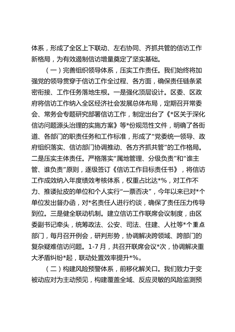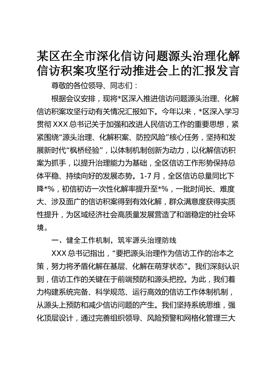 某區(qū)在全市深化信訪問題源頭治理化解信訪積案攻堅(jiān)行動推進(jìn)會上的匯報(bào)發(fā)言尊敬的各位領(lǐng)導(dǎo)、同志們:根據(jù)會議安排,現(xiàn)將*區(qū)深入推進(jìn)信訪問題源頭治理、化解信訪積案攻堅(jiān)行動有關(guān)情況匯報(bào)如下。今年以來,*區(qū)深入學(xué)習(xí)貫徹XXX總書記關(guān)于加強(qiáng)和改進(jìn)人民信訪工作的重要思想,緊“”緊圍繞源頭治理、化解積案、防控風(fēng)險(xiǎn)核心任務(wù),堅(jiān)持和發(fā)“”展新時(shí)代楓橋經(jīng)驗(yàn),以體制機(jī)制創(chuàng)新為動力,以化解信訪積案為抓手,以提升治理能力為基礎(chǔ),全區(qū)信訪工作形勢保持總體平穩(wěn)、持續(xù)向好的發(fā)展態(tài)勢。1-7月,全區(qū)信訪總量同比下降*%,初信初訪一次性化解率提升至*%,一批時(shí)間長、難度大、涉及...