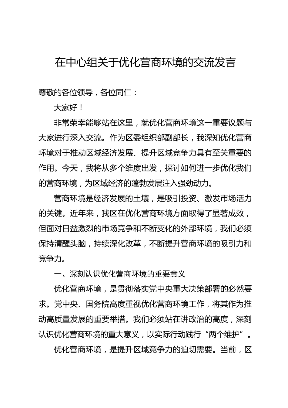 區(qū)委組織部副部長(zhǎng)在中心組關(guān)于優(yōu)化營(yíng)商環(huán)境的交流發(fā)言VIP免費(fèi)