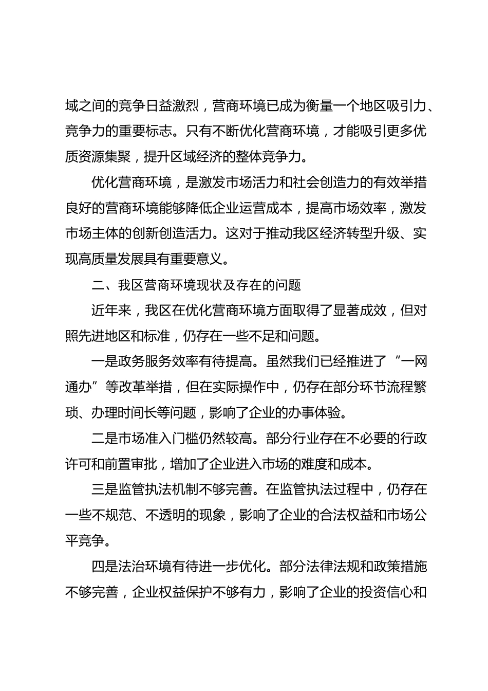 在中心組關(guān)于優(yōu)化營(yíng)商環(huán)境的交流發(fā)言尊敬的各位領(lǐng)導(dǎo),各位同仁:大家好!非常榮幸能夠站在這里,就優(yōu)化營(yíng)商環(huán)境這一重要議題與大家進(jìn)行深入交流。作為區(qū)委組織部副部長(zhǎng),我深知優(yōu)化營(yíng)商環(huán)境對(duì)于推動(dòng)區(qū)域經(jīng)濟(jì)發(fā)展、提升區(qū)域競(jìng)爭(zhēng)力具有至關(guān)重要的作用。今天,我將從多個(gè)維度出發(fā),探討如何進(jìn)一步優(yōu)化我們的營(yíng)商環(huán)境,為區(qū)域經(jīng)濟(jì)的蓬勃發(fā)展注入強(qiáng)勁動(dòng)力。營(yíng)商環(huán)境是經(jīng)濟(jì)發(fā)展的土壤,是吸引投資、激發(fā)市場(chǎng)活力的關(guān)鍵。近年來,我區(qū)在優(yōu)化營(yíng)商環(huán)境方面取得了顯著成效,但面對(duì)日益激烈的市場(chǎng)競(jìng)爭(zhēng)和不斷變化的外部環(huán)境,我們必須保持清醒頭腦,持續(xù)深化改革,不斷提升營(yíng)商環(huán)境的...
