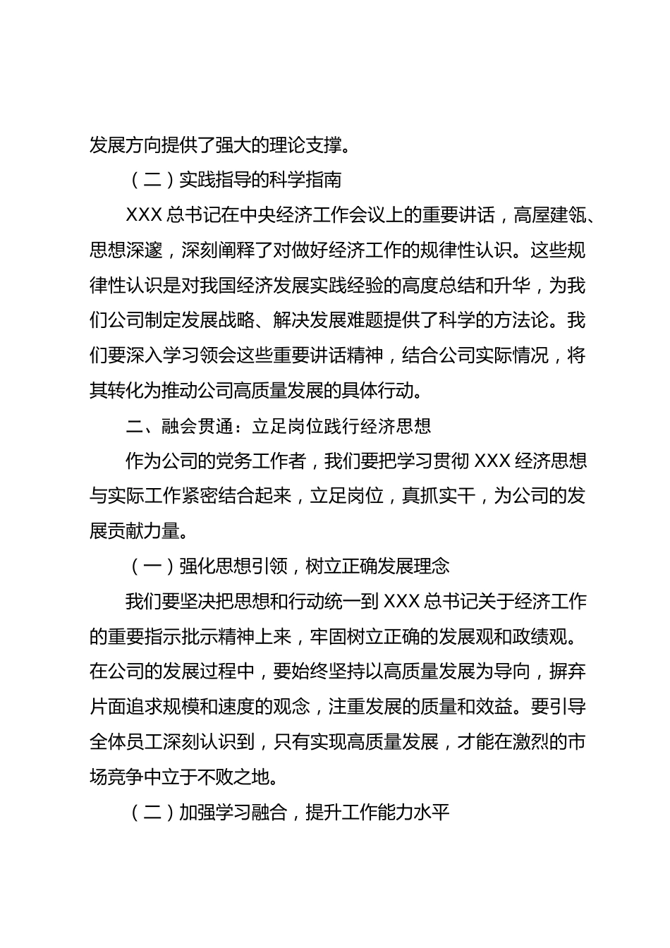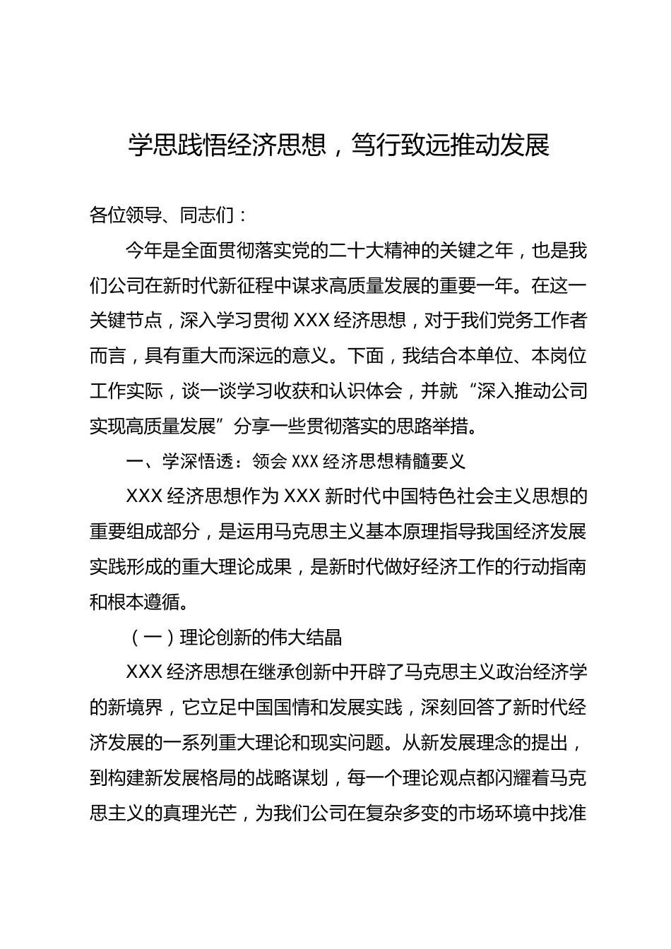 學(xué)思踐悟經(jīng)濟思想,篤行致遠推動發(fā)展各位領(lǐng)導(dǎo)、同志們:今年是全面貫徹落實黨的二十大精神的關(guān)鍵之年,也是我們公司在新時代新征程中謀求高質(zhì)量發(fā)展的重要一年。在這一關(guān)鍵節(jié)點,深入學(xué)習(xí)貫徹XXX經(jīng)濟思想,對于我們黨務(wù)工作者而言,具有重大而深遠的意義。下面,我結(jié)合本單位、本崗位工作實際,談一談學(xué)習(xí)收獲和認(rèn)識體會,并就“深入推動公司實現(xiàn)高質(zhì)量發(fā)展”分享一些貫徹落實的思路舉措。一、學(xué)深悟透:領(lǐng)會XXX經(jīng)濟思想精髓要義XXX經(jīng)濟思想作為XXX新時代中國特色社會主義思想的重要組成部分,是運用馬克思主義基本原理指導(dǎo)我國經(jīng)濟發(fā)展實踐形成的重大理論成果,是新時代...