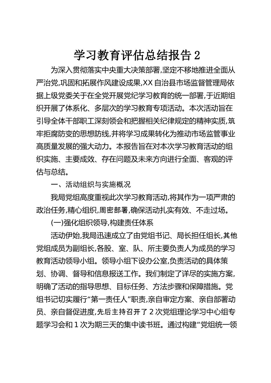 學(xué)習(xí)教育評(píng)估總結(jié)報(bào)告2為深入貫徹落實(shí)中央重大決策部署,堅(jiān)定不移地推進(jìn)全面從嚴(yán)治黨,鞏固和拓展作風(fēng)建設(shè)成果,XX自治縣市場監(jiān)督管理局依據(jù)上級(jí)黨委關(guān)于在全黨開展黨紀(jì)學(xué)習(xí)教育的統(tǒng)一部署,于近期組織開展了體系化、多層次的學(xué)習(xí)教育專項(xiàng)活動(dòng)。本次活動(dòng)旨在引導(dǎo)全體干部職工深刻領(lǐng)會(huì)和把握相關(guān)紀(jì)律規(guī)定的精神實(shí)質(zhì),筑牢拒腐防變的思想防線,并將學(xué)習(xí)成果轉(zhuǎn)化為推動(dòng)市場監(jiān)管事業(yè)高質(zhì)量發(fā)展的強(qiáng)大動(dòng)力。本報(bào)告旨在對(duì)本次學(xué)習(xí)教育活動(dòng)的組織實(shí)施、主要成效、存在問題及未來方向進(jìn)行全面、客觀的評(píng)估與總結(jié)。一、活動(dòng)組織與實(shí)施概況我局黨組高度重視此次學(xué)習(xí)教育活動(dòng),將其作為一項(xiàng)...