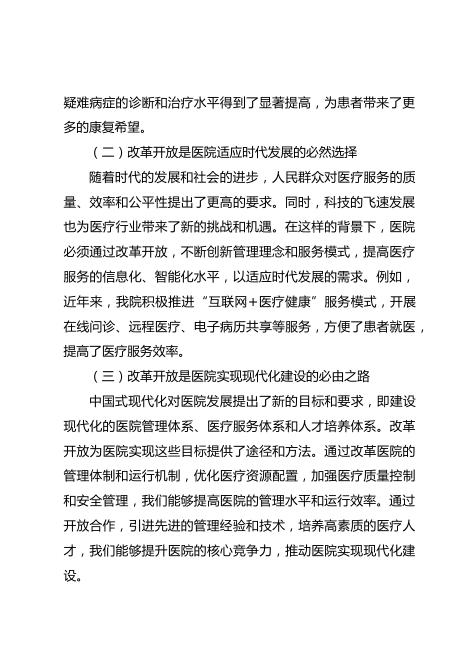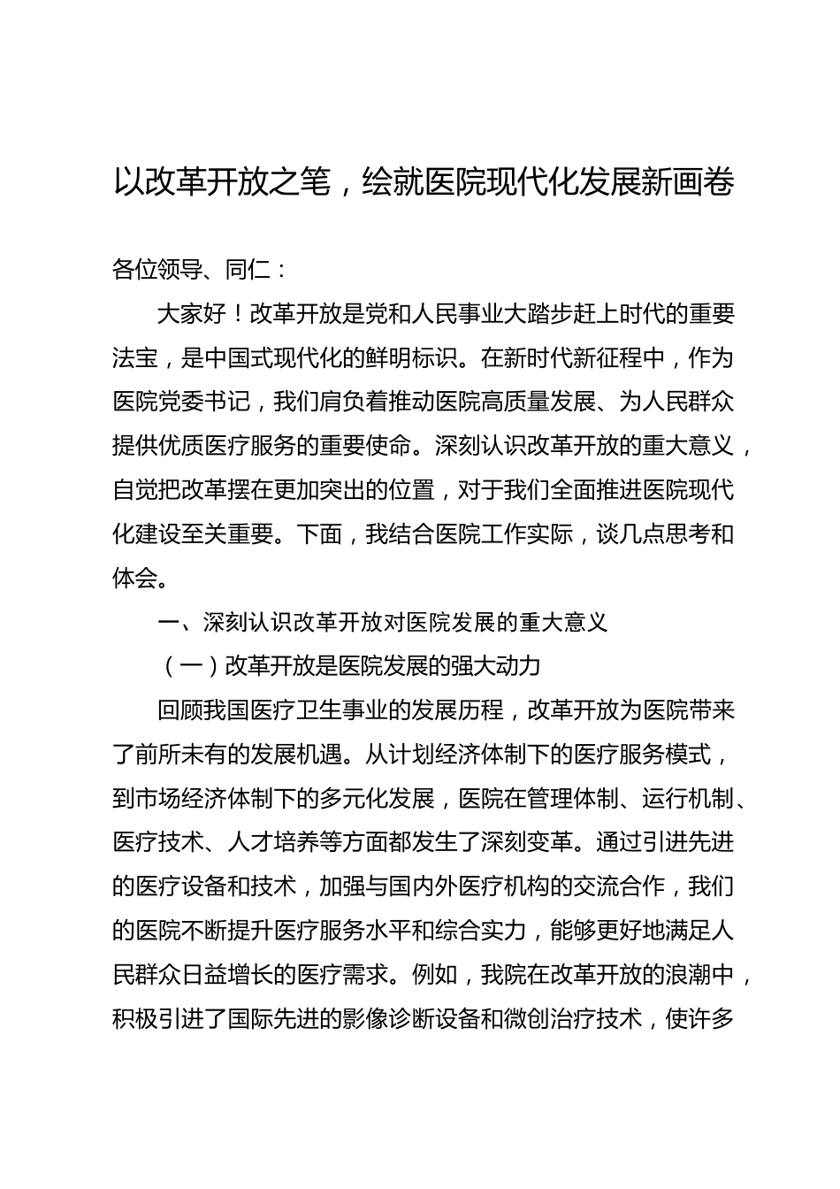 以改革開放之筆,繪就醫(yī)院現(xiàn)代化發(fā)展新畫卷各位領(lǐng)導(dǎo)、同仁:大家好!改革開放是黨和人民事業(yè)大踏步趕上時代的重要法寶,是中國式現(xiàn)代化的鮮明標識。在新時代新征程中,作為醫(yī)院黨委書記,我們肩負著推動醫(yī)院高質(zhì)量發(fā)展、為人民群眾提供優(yōu)質(zhì)醫(yī)療服務(wù)的重要使命。深刻認識改革開放的重大意義,自覺把改革擺在更加突出的位置,對于我們?nèi)嫱七M醫(yī)院現(xiàn)代化建設(shè)至關(guān)重要。下面,我結(jié)合醫(yī)院工作實際,談幾點思考和體會。一、深刻認識改革開放對醫(yī)院發(fā)展的重大意義(一)改革開放是醫(yī)院發(fā)展的強大動力回顧我國醫(yī)療衛(wèi)生事業(yè)的發(fā)展歷程,改革開放為醫(yī)院帶來了前所未有的發(fā)展機遇。...