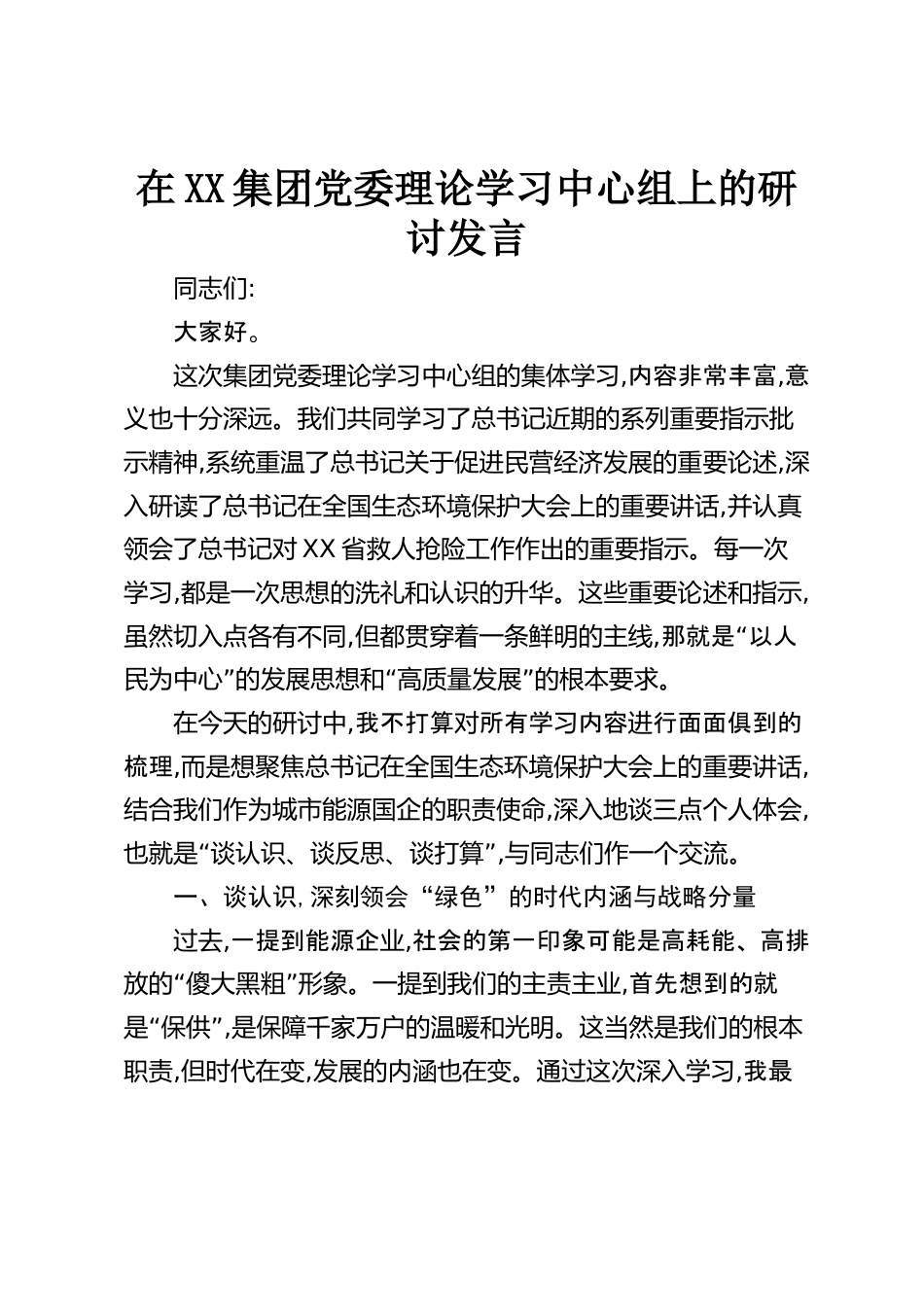 在XX集團(tuán)黨委理論學(xué)習(xí)中心組上的研討發(fā)言同志們:大家好。這次集團(tuán)黨委理論學(xué)習(xí)中心組的集體學(xué)習(xí),內(nèi)容非常豐富,意義也十分深遠(yuǎn)。我們共同學(xué)習(xí)了總書記近期的系列重要指示批示精神,系統(tǒng)重溫了總書記關(guān)于促進(jìn)民營經(jīng)濟(jì)發(fā)展的重要論述,深入研讀了總書記在全國生態(tài)環(huán)境保護(hù)大會上的重要講話,并認(rèn)真領(lǐng)會了總書記對XX省救人搶險工作作出的重要指示。每一次學(xué)習(xí),都是一次思想的洗禮和認(rèn)識的升華。這些重要論述和指示,雖然切入點各有不同,但都貫穿著一條鮮明的主線,“那就是以人”“”民為中心的發(fā)展思想和高質(zhì)量發(fā)展的根本要求。在今天的研討中,我不打算所有學(xué)內(nèi)容行面面俱到的對...
