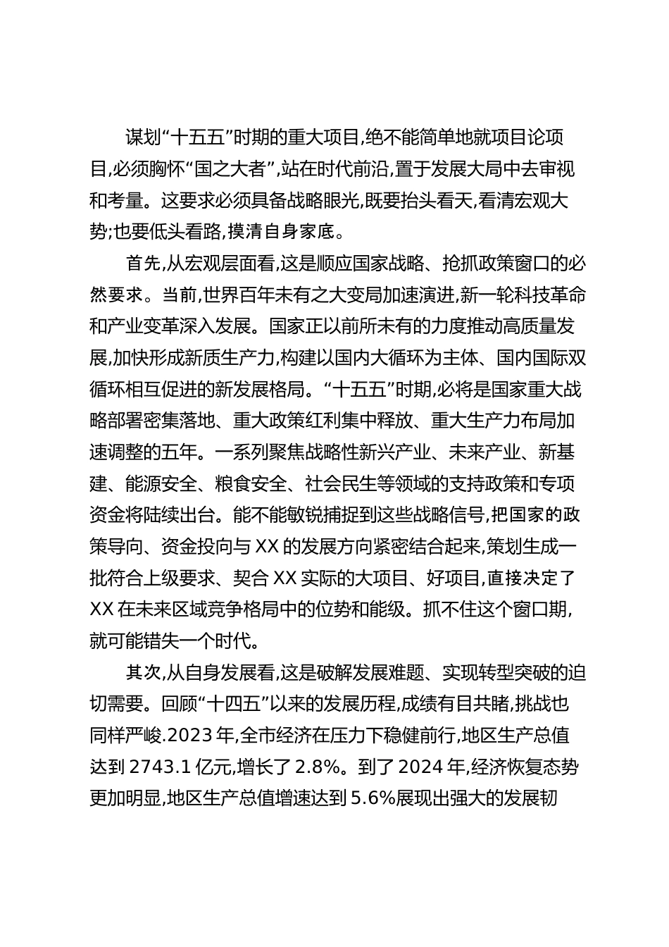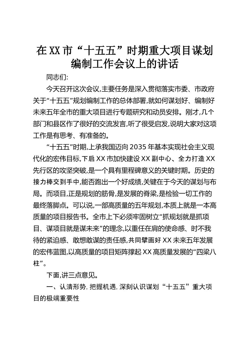 在XX市“十五五”時(shí)期重大項(xiàng)目謀劃編制工作會(huì)議上的講話同志們:今天召開(kāi)這次會(huì)議,主要任務(wù)是深入貫徹落實(shí)市委、市政府“”關(guān)于十五五規(guī)劃編制工作的總體部署,就如何謀劃好、編制好未來(lái)五年全市的重大項(xiàng)目進(jìn)行專(zhuān)題研究和動(dòng)員安排。剛才,幾個(gè)部門(mén)和縣區(qū)作了很好的交流發(fā)言,聽(tīng)了很受啟發(fā),說(shuō)明大家對(duì)這項(xiàng)工作是有思考、有準(zhǔn)備的。“”十五五時(shí)期,上承我國(guó)邁向2035年基本實(shí)現(xiàn)社會(huì)主義現(xiàn)代化的宏偉目標(biāo),下啟XX市加快建設(shè)XX副中心、全力打造XX先行區(qū)的攻堅(jiān)突破,是一個(gè)具有里程碑意義的關(guān)鍵時(shí)期。歷史的接力棒交到手中,能否跑出一個(gè)好成績(jī),關(guān)鍵在于今天的謀劃與布局。而項(xiàng)目,正是...