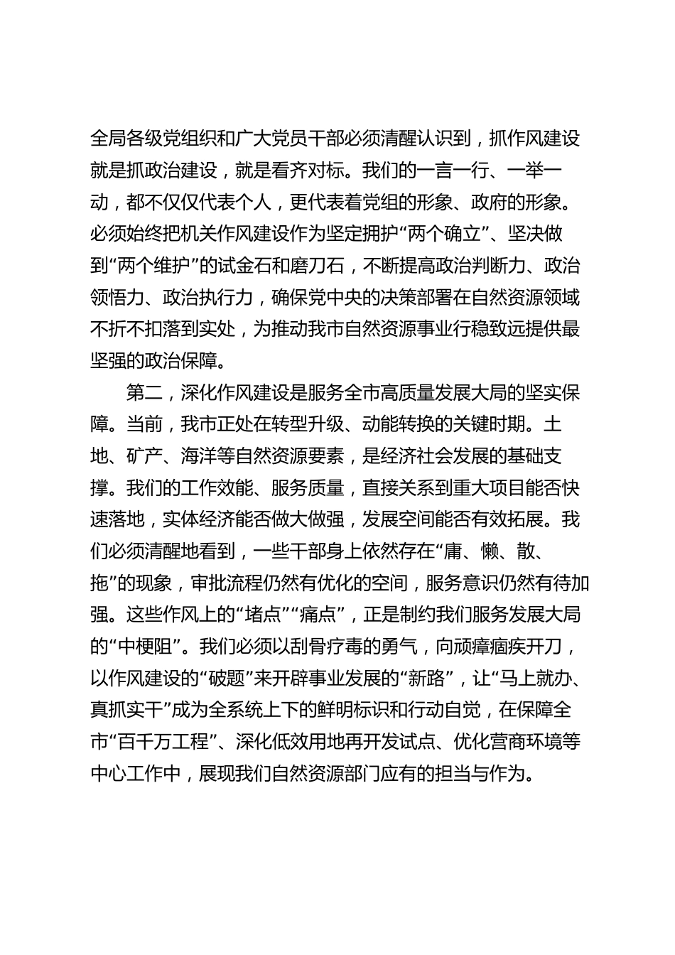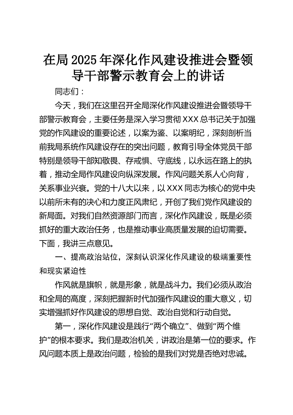 在局2025年深化作風(fēng)建設(shè)推進(jìn)會(huì)暨領(lǐng)導(dǎo)干部警示教育會(huì)上的講話同志們:今天,我們?cè)谶@里召開全局深化作風(fēng)建設(shè)推進(jìn)會(huì)暨領(lǐng)導(dǎo)干部警示教育會(huì),主要任務(wù)是深入學(xué)習(xí)貫徹XXX總書記關(guān)于加強(qiáng)黨的作風(fēng)建設(shè)的重要論述,以案為鑒、以案明紀(jì),深刻剖析當(dāng)前我局系統(tǒng)作風(fēng)建設(shè)存在的突出問題,教育引導(dǎo)全體黨員干部特別是領(lǐng)導(dǎo)干部知敬畏、存戒懼、守底線,以永遠(yuǎn)在路上的執(zhí)著,推動(dòng)全局作風(fēng)建設(shè)向縱深發(fā)展。作風(fēng)問題關(guān)系人心向背,關(guān)系事業(yè)興衰。黨的十八大以來,以XXX同志為核心的黨中央以前所未有的決心和力度正風(fēng)肅紀(jì),開創(chuàng)了我們黨作風(fēng)建設(shè)的新局面。對(duì)我們自然資源部門而言,深化作風(fēng)...