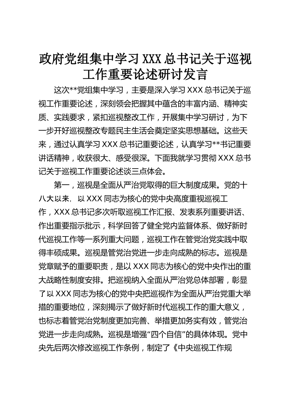 政府黨組集中學(xué)習(xí)XXX總書記關(guān)于巡視工作重要論述研討發(fā)言這次**黨組集中學(xué)習(xí),主要是深入學(xué)習(xí)XXX總書記關(guān)于巡視工作重要論述,深刻領(lǐng)會把握其中蘊(yùn)含的豐富內(nèi)涵、精神實質(zhì)、實踐要求,緊扣巡視整改工作,開展集中學(xué)習(xí)研討,為下一步開好巡視整改專題民主生活會奠定堅實思想基礎(chǔ)。這些天來,通過認(rèn)真學(xué)習(xí)XXX總書記重要論述,認(rèn)真學(xué)習(xí)**書記重要講話精神,收獲很大、感受很深。下面我就學(xué)習(xí)貫徹XXX總書記關(guān)于巡視工作重要論述談三點體會。第一,巡視是全面從嚴(yán)治黨取得的巨大制度成果。黨的十八大以來,以XXX同志為核心的黨中央高度重視巡視工作,XXX總書記多次聽取巡視工作...