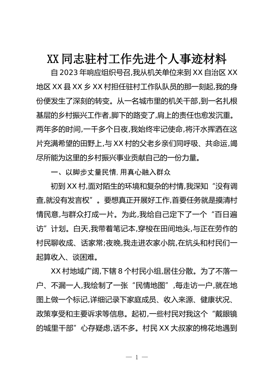 XX同志駐村工作先進(jìn)個人事跡材料