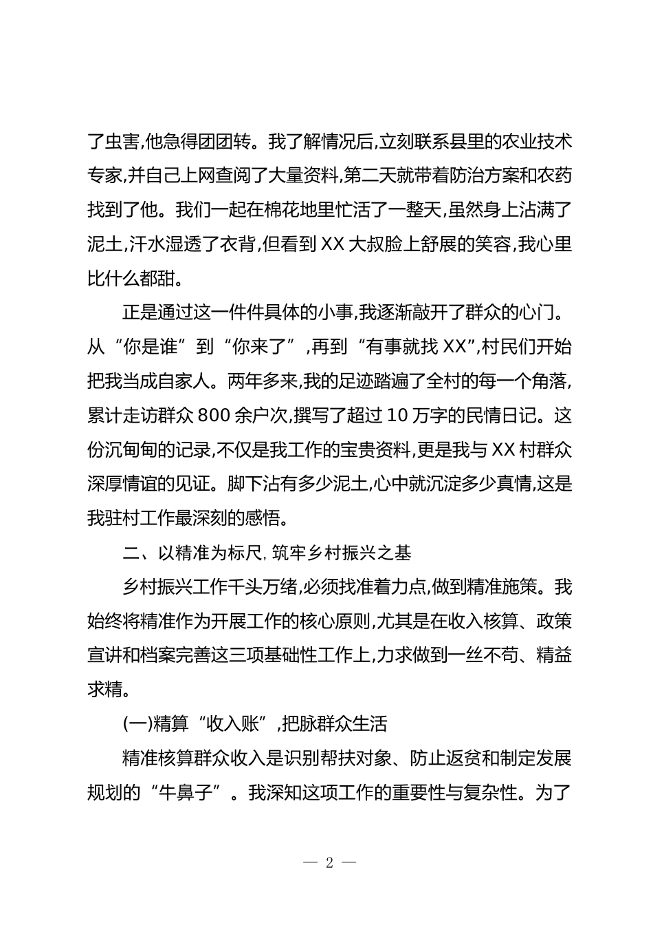 XX同志駐村工作先進(jìn)個人事跡材料自2023年響應(yīng)組織號召,我從機(jī)關(guān)單位來到XX自治區(qū)XX地區(qū)XX縣XX鄉(xiāng)XX村擔(dān)任駐村工作隊隊員的那一刻起,我的身份便發(fā)生了深刻的轉(zhuǎn)變。從一名城市里的機(jī)關(guān)干部,到一名扎根基層的鄉(xiāng)村振興工作者,腳下的路變了,肩上的責(zé)任也愈發(fā)沉重。兩年多的時間,一千多個日夜,我始終牢記使命,將汗水揮灑在這片充滿希望的田野上,與XX村的父老鄉(xiāng)親們同呼吸、共命運(yùn),竭盡所能為這里的鄉(xiāng)村振興事業(yè)貢獻(xiàn)自己的一份力量。一、以腳步丈量民情,用真心融入群眾初到XX村,面對陌生的環(huán)境和復(fù)雜的村情,我深知“沒有調(diào)查,就沒有發(fā)言權(quán)”。要想真正開展好工作,首要任務(wù)就是摸...