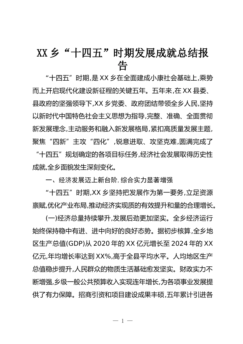 XX鄉(xiāng)“十四五”時(shí)期發(fā)展成就總結(jié)報(bào)告“十四五”時(shí)期,是XX鄉(xiāng)在全面建成小康社會(huì)基礎(chǔ)上,乘勢(shì)而上開啟現(xiàn)代化建設(shè)新征程的關(guān)鍵五年。五年來,在XX縣委、縣政府的堅(jiān)強(qiáng)領(lǐng)導(dǎo)下,XX鄉(xiāng)黨委、政府團(tuán)結(jié)帶領(lǐng)全鄉(xiāng)人民,堅(jiān)持以新時(shí)代中國特色社會(huì)主義思想為指導(dǎo),完整、準(zhǔn)確、全面貫徹新發(fā)展理念,主動(dòng)服務(wù)和融入新發(fā)展格局,緊扣高質(zhì)量發(fā)展主題,聚焦“四新”主攻“四化”,銳意進(jìn)取、攻堅(jiān)克難,圓滿完成了“十四五”規(guī)劃確定的各項(xiàng)目標(biāo)任務(wù),經(jīng)濟(jì)社會(huì)發(fā)展取得歷史性成就,全鄉(xiāng)面貌發(fā)生深刻變化。一、經(jīng)濟(jì)發(fā)展邁上新臺(tái)階,綜合實(shí)力顯著增強(qiáng)“十四五”時(shí)期,XX鄉(xiāng)堅(jiān)持把發(fā)展作為第一要?jiǎng)?wù),立足資源稟賦...