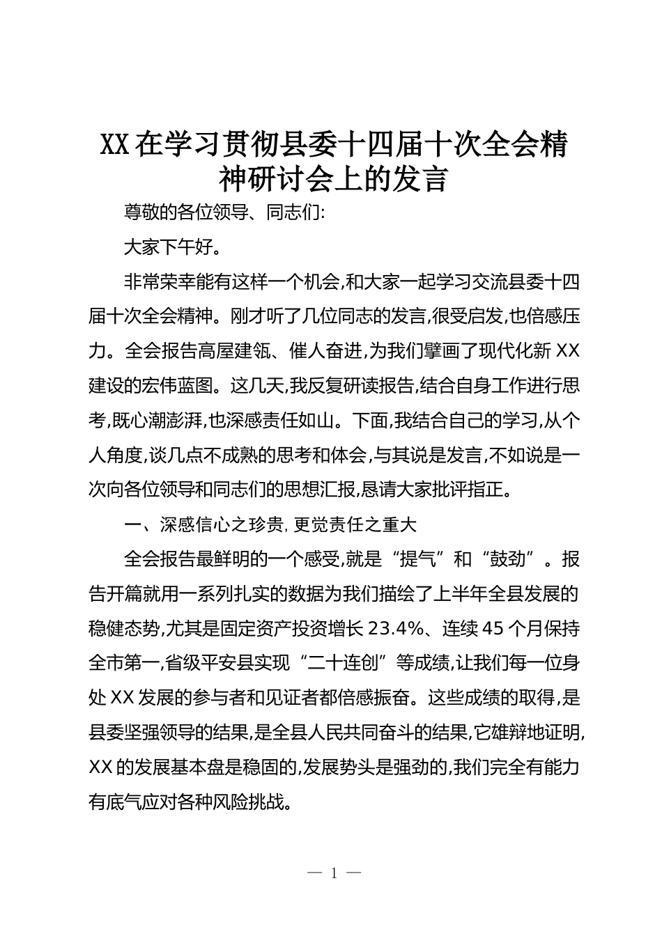XX在學(xué)習(xí)貫徹縣委十四屆十次全會(huì)精神研討會(huì)上的發(fā)言尊敬的各位領(lǐng)導(dǎo)、同志們:大家下午好。非常榮幸能有這樣一個(gè)機(jī)會(huì),和大家一起學(xué)習(xí)交流縣委十四屆十次全會(huì)精神。剛才聽了幾位同志的發(fā)言,很受啟發(fā),也倍感壓力。全會(huì)報(bào)告高屋建瓴、催人奮進(jìn),為我們擘畫了現(xiàn)代化新XX建設(shè)的宏偉藍(lán)圖。這幾天,我反復(fù)研讀報(bào)告,結(jié)合自身工作進(jìn)行思考,既心潮澎湃,也深感責(zé)任如山。下面,我結(jié)合自己的學(xué)習(xí),從個(gè)人角度,談幾點(diǎn)不成熟的思考和體會(huì),與其說(shuō)是發(fā)言,不如說(shuō)是一次向各位領(lǐng)導(dǎo)和同志們的思想?yún)R報(bào),懇請(qǐng)大家批評(píng)指正。一、深感信心之珍貴,更覺(jué)責(zé)任之重大全會(huì)報(bào)告最鮮明的一個(gè)感受,就是“提氣”...