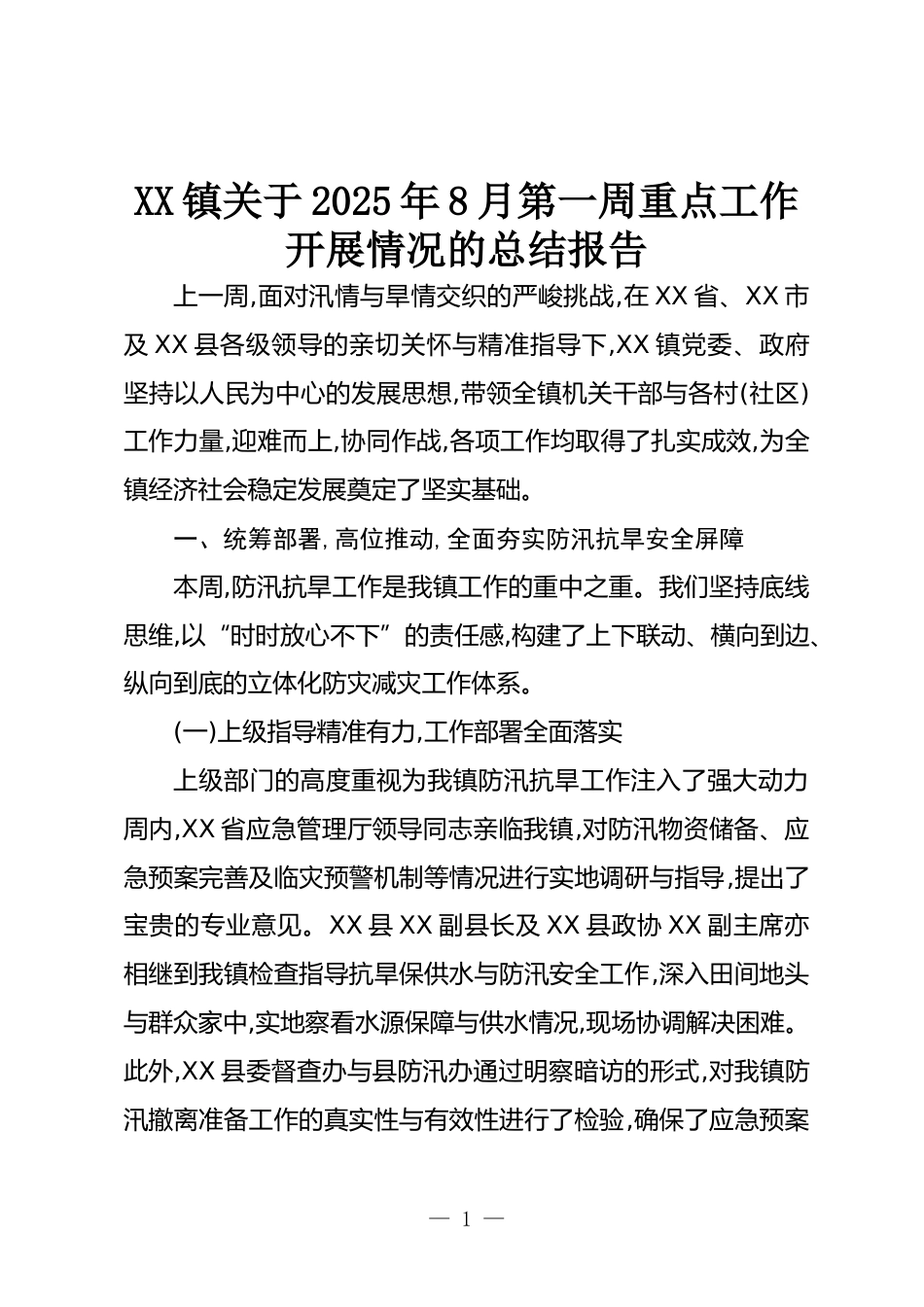 XX鎮(zhèn)關(guān)于2025年8月第一周重點(diǎn)工作開展情況的總結(jié)報(bào)告