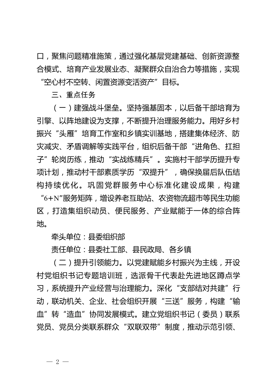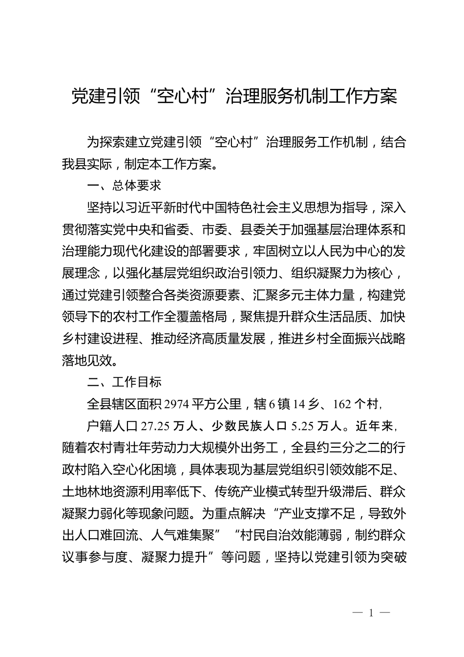 黨建引領(lǐng)“空心村”治理服務(wù)機(jī)制工作方案為探索建立黨建引領(lǐng)“空心村”治理服務(wù)工作機(jī)制,結(jié)合我縣實(shí)際,制定本工作方案。一、總體要求堅(jiān)持以習(xí)近平新時(shí)代中國特色社會(huì)主義思想為指導(dǎo),深入貫徹落實(shí)黨中央和省委、市委、縣委關(guān)于加強(qiáng)基層治理體系和治理能力現(xiàn)代化建設(shè)的部署要求,牢固樹立以人民為中心的發(fā)展理念,以強(qiáng)化基層黨組織政治引領(lǐng)力、組織凝聚力為核心,通過黨建引領(lǐng)整合各類資源要素、匯聚多元主體力量,構(gòu)建黨領(lǐng)導(dǎo)下的農(nóng)村工作全覆蓋格局,聚焦提升群眾生活品質(zhì)、加快鄉(xiāng)村建設(shè)進(jìn)程、推動(dòng)經(jīng)濟(jì)高質(zhì)量發(fā)展,推進(jìn)鄉(xiāng)村全面振興戰(zhàn)略落地見效。二、工作目標(biāo)全縣轄區(qū)...