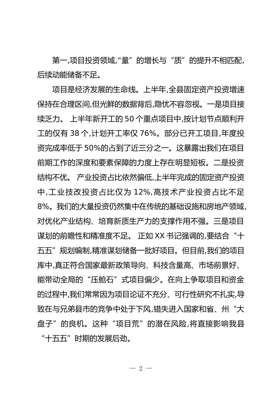 關(guān)于分管領(lǐng)域存在問題及“十五五”規(guī)劃編制的講話稿尊敬的XX書記、XX縣長,各位委員、同志們:剛才,XX書記就我縣上半年經(jīng)濟形勢作了深刻分析,并對下半年經(jīng)濟工作和“十五五”規(guī)劃編制提出了明確要求,思想深邃、立意高遠,具有很強的指導(dǎo)性。我完全贊同,并將堅決抓好貫徹落實。根據(jù)會議安排,下面我結(jié)合自己分管的幾個領(lǐng)域,聚焦當前存在的突出問題和短板,談一些初步思考,為我縣科學(xué)編制“十五五”規(guī)劃提供一些事實參考?!笆奈濉奔磳⑹展?我們既要肯定成績,更要正視問題。只有把問題找準、把根源挖深,才能在“十五五”時期找準方向、精準發(fā)力。當前,我縣經(jīng)濟運行總體平穩(wěn)向...