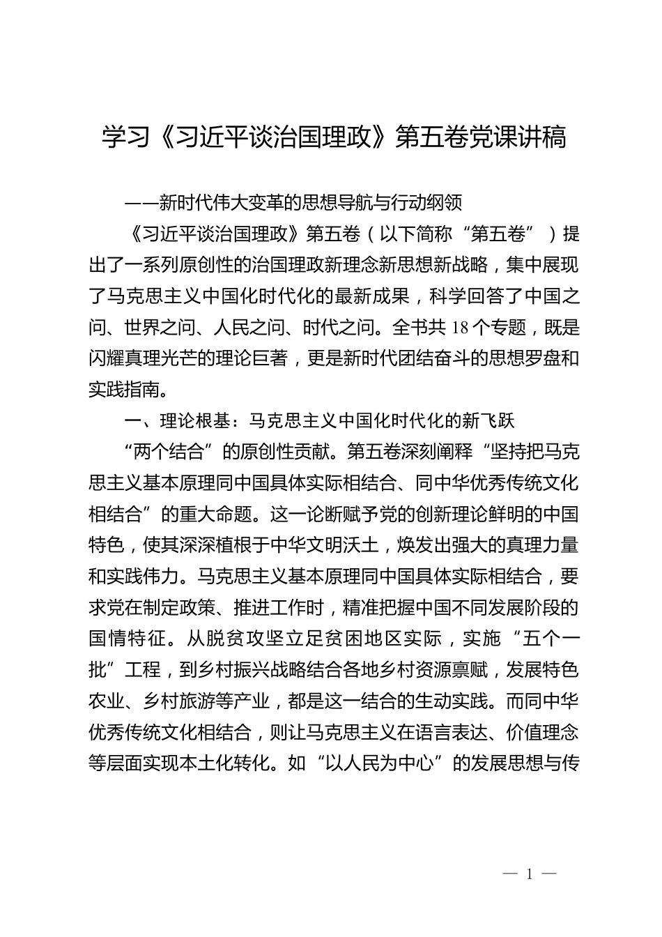 學習《習近平談治國理政》第五卷黨課講稿——新時代偉大變革的思想導航與行動綱領(lǐng)《習近平談治國理政》第五卷(以下簡稱“第五卷”)提出了一系列原創(chuàng)性的治國理政新理念新思想新戰(zhàn)略,集中展現(xiàn)了馬克思主義中國化時代化的最新成果,科學回答了中國之問、世界之問、人民之問、時代之問。全書共18個專題,既是閃耀真理光芒的理論巨著,更是新時代團結(jié)奮斗的思想羅盤和實踐指南。一、理論根基:馬克思主義中國化時代化的新飛躍“兩個結(jié)合”的原創(chuàng)性貢獻。第五卷深刻闡釋“堅持把馬克思主義基本原理同中國具體實際相結(jié)合、同中華優(yōu)秀傳統(tǒng)文化相結(jié)合”的重大命題。這一論斷賦...