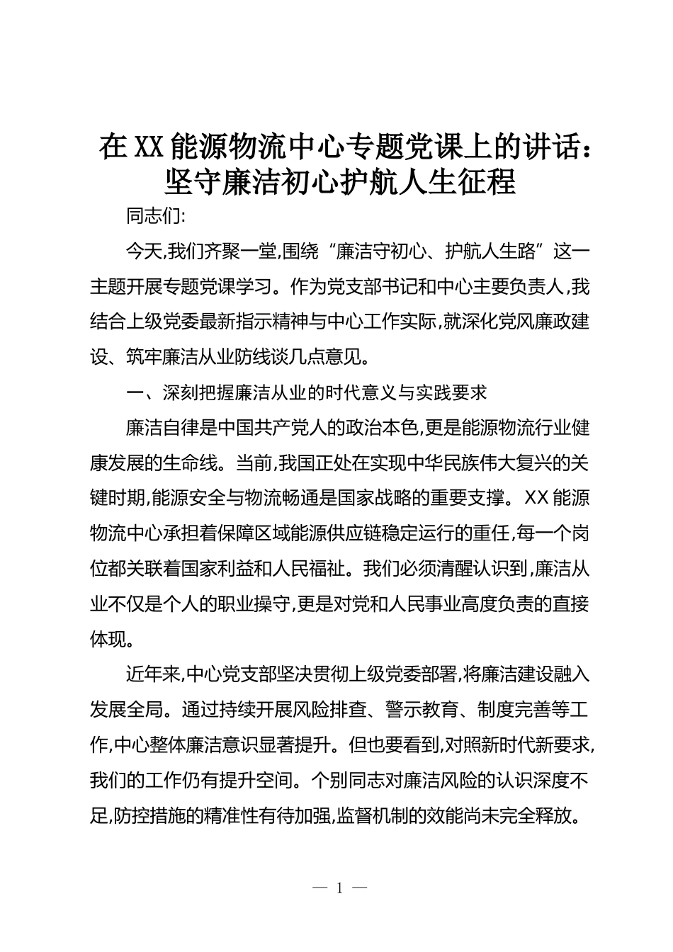 在XX能源物流中心專題黨課上的講話:堅(jiān)守廉潔初心護(hù)航人生征程同志們:今天,我們齊聚一堂,圍繞“廉潔守初心、護(hù)航人生路”這一主題開展專題黨課學(xué)習(xí)。作為黨支部書記和中心主要負(fù)責(zé)人,我結(jié)合上級(jí)黨委最新指示精神與中心工作實(shí)際,就深化黨風(fēng)廉政建設(shè)、筑牢廉潔從業(yè)防線談幾點(diǎn)意見。一、深刻把握廉潔從業(yè)的時(shí)代意義與實(shí)踐要求廉潔自律是中國(guó)共產(chǎn)黨人的政治本色,更是能源物流行業(yè)健康發(fā)展的生命線。當(dāng)前,我國(guó)正處在實(shí)現(xiàn)中華民族偉大復(fù)興的關(guān)鍵時(shí)期,能源安全與物流暢通是國(guó)家戰(zhàn)略的重要支撐。XX能源物流中心承擔(dān)著保障區(qū)域能源供應(yīng)鏈穩(wěn)定運(yùn)行的重任,每一個(gè)崗位都關(guān)聯(lián)著國(guó)家利...
