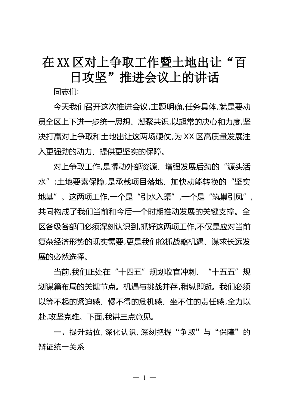 在XX區(qū)對上爭取工作暨土地出讓“百日攻堅”推進會議上的講話同志們:今天我們召開這次推進會議,主題明確,任務(wù)具體,就是要動員全區(qū)上下進一步統(tǒng)一思想、凝聚共識,以超常的決心和力度,堅決打贏對上爭取和土地出讓這兩場硬仗,為XX區(qū)高質(zhì)量發(fā)展注入更強勁的動力、提供更堅實的保障。對上爭取工作,是撬動外部資源、增強發(fā)展后勁的“源頭活水”;土地要素保障,是承載項目落地、加快動能轉(zhuǎn)換的“堅實地基”。這兩項工作,一個是“引水入渠”,一個是“筑巢引鳳”,共同構(gòu)成了我們當(dāng)前和今后一個時期推動發(fā)展的關(guān)鍵支撐。全區(qū)各級各部門必須深刻認識到,抓好這兩項工作,不僅是應(yīng)對當(dāng)前...
