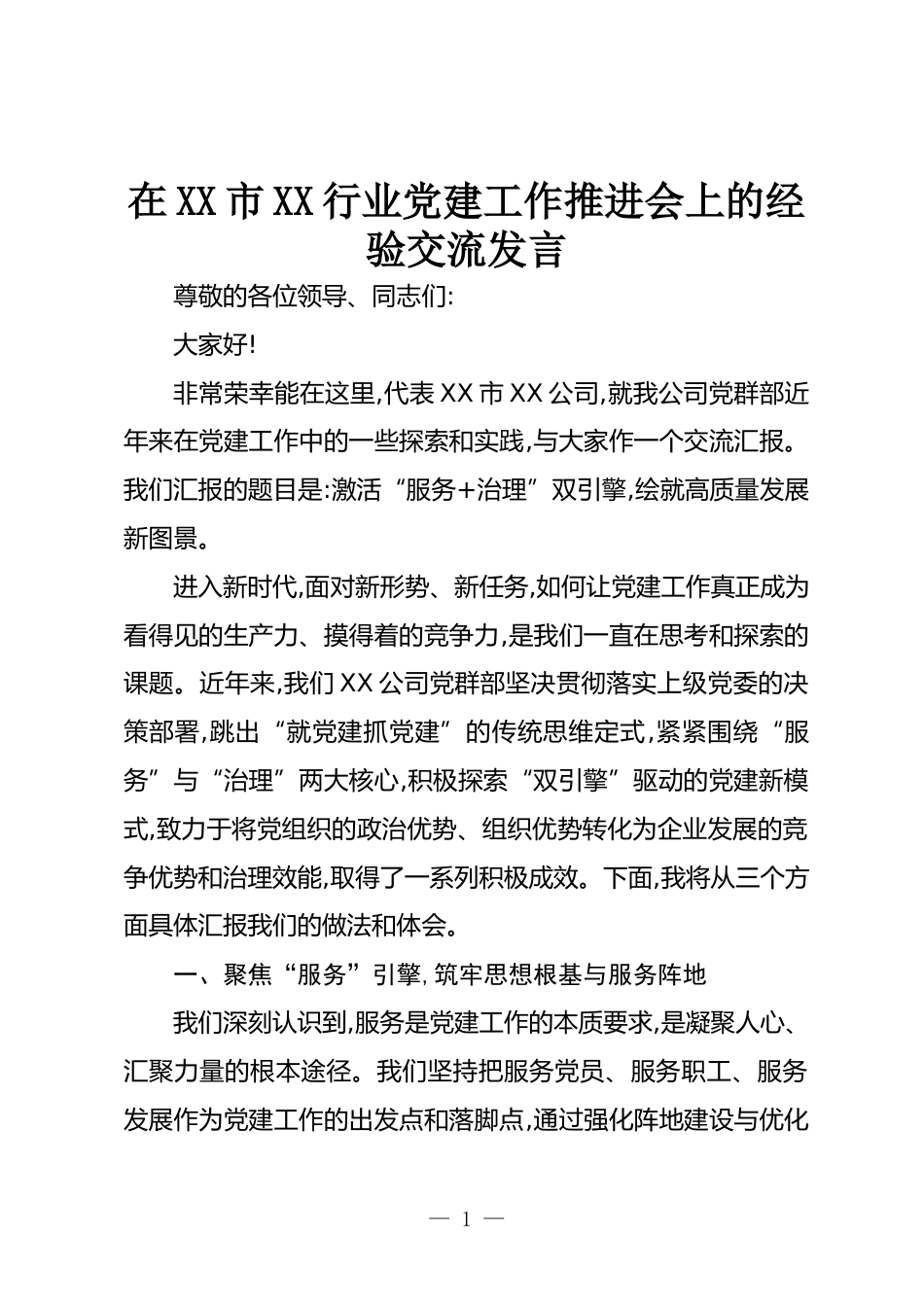 在XX市XX行業(yè)黨建工作推進(jìn)會(huì)上的經(jīng)驗(yàn)交流發(fā)言尊敬的各位領(lǐng)導(dǎo)、同志們:大家好!非常榮幸能在這里,代表XX市XX公司,就我公司黨群部近年來(lái)在黨建工作中的一些探索和實(shí)踐,與大家作一個(gè)交流匯報(bào)。我們匯報(bào)的題目是:激活“服務(wù)+治理”雙引擎,繪就高質(zhì)量發(fā)展新圖景。進(jìn)入新時(shí)代,面對(duì)新形勢(shì)、新任務(wù),如何讓黨建工作真正成為看得見(jiàn)的生產(chǎn)力、摸得著的競(jìng)爭(zhēng)力,是我們一直在思考和探索的課題。近年來(lái),我們XX公司黨群部堅(jiān)決貫徹落實(shí)上級(jí)黨委的決策部署,跳出“就黨建抓黨建”的傳統(tǒng)思維定式,緊緊圍繞“服務(wù)”與“治理”兩大核心,積極探索“雙引擎”驅(qū)動(dòng)的黨建新模式,致力于將黨組織的政治...