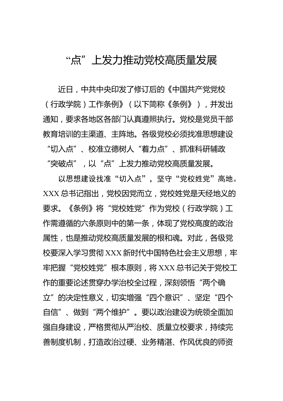 《中國共產(chǎn)黨黨校(行政學(xué)院)工作條例》學(xué)習(xí)心得匯編(8篇)(202508)目錄1.“點(diǎn)”上發(fā)力推動(dòng)黨校高質(zhì)量發(fā)展..............................22.“三個(gè)緊扣”筑牢新時(shí)代黨校主陣地..........................43.“為黨育才”踐使命“熔爐淬火”鑄鐵軍.................74.把握“三個(gè)維度”讓基層黨校找準(zhǔn)“角色定位”..105.培根鑄魂讓黨校成為黨員干部成長“大熔爐”.....136.四維強(qiáng)校開創(chuàng)新時(shí)代黨校工作嶄新局面.................167.興黨校偉業(yè)育時(shí)代賢才獻(xiàn)發(fā)展良策........................198.在新時(shí)代新征程上奮力譜寫黨校工作嶄新篇章......22“點(diǎn)”上發(fā)力推動(dòng)黨...