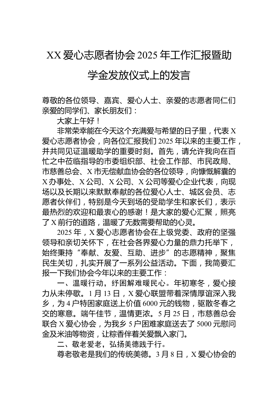 XX愛心志愿者協(xié)會2025年工作匯報(bào)暨助學(xué)金發(fā)放儀式上的發(fā)言尊敬的各位領(lǐng)導(dǎo)、嘉賓、愛心人士、親愛的志愿者同仁們親愛的同學(xué)們、家長朋友們:大家上午好!非常榮幸能在今天這個(gè)充滿愛與希望的日子里,代表X愛心志愿者協(xié)會,向各位匯報(bào)我們2025年以來的主要工作,并共同見證溫暖助學(xué)的重要時(shí)刻。首先,請?jiān)试S我向在百忙之中蒞臨指導(dǎo)的市委組織部、社會工作部、市民政局、市慈善總會、X市無償獻(xiàn)血協(xié)會的各位領(lǐng)導(dǎo),向慷慨解囊的X辦事處、X公司、X公司、X公司等愛心企業(yè)代表,向現(xiàn)場以及長期以來默默奉獻(xiàn)的各位愛心人士、城區(qū)會員、志愿者伙伴們,特別是今天到場的受助學(xué)生和家...