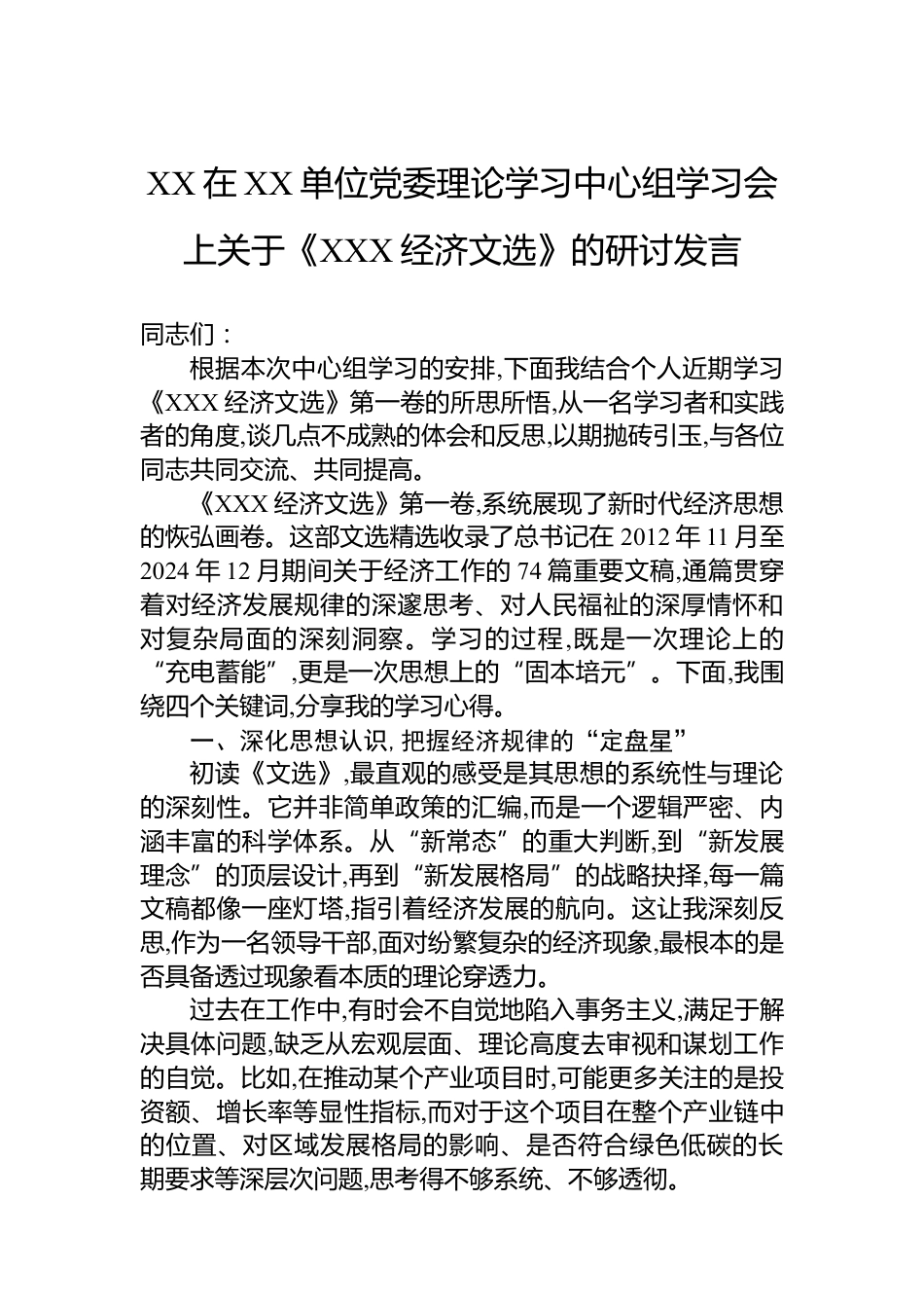 XX在XX單位黨委理論學(xué)習(xí)中心組學(xué)習(xí)會(huì)上關(guān)于《習(xí)近平經(jīng)濟(jì)文選》的研討發(fā)言