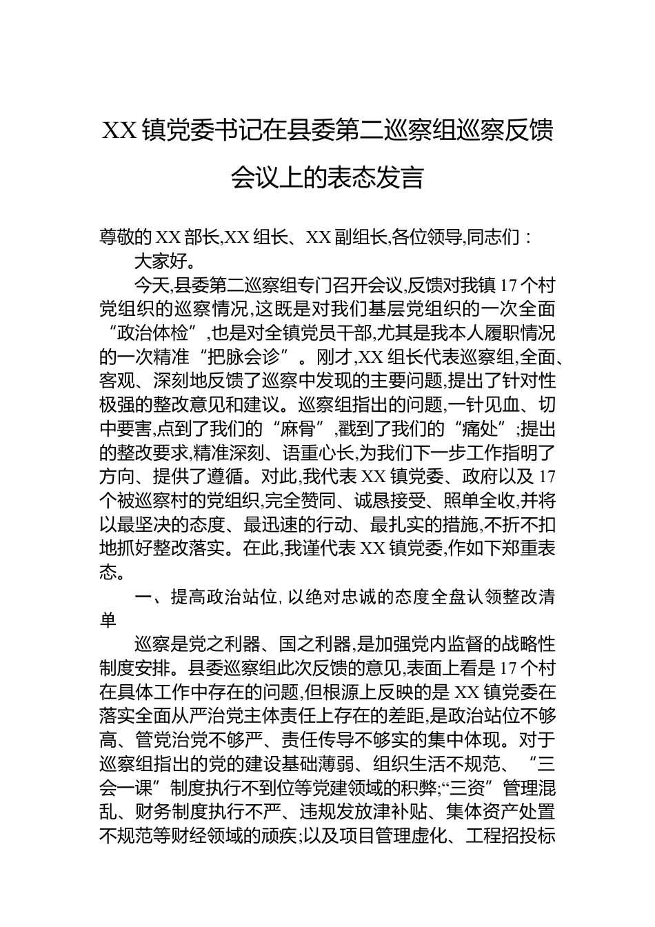 XX鎮(zhèn)黨委書記在縣委第二巡察組巡察反饋會(huì)議上的表態(tài)發(fā)言