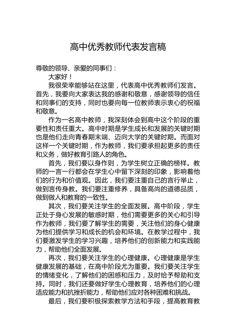高中優(yōu)秀教師代表發(fā)言稿尊敬的領(lǐng)導(dǎo)、親愛的同事們:大家好!我很榮幸能夠站在這里,代表高中優(yōu)秀教師們發(fā)言。首先,我要向大家表達(dá)我的感謝和敬意,感謝領(lǐng)導(dǎo)的信任和同事們的支持,同時(shí)也要向每一位教師表示衷心的祝福和敬意。作為一名高中教師,我深刻體會(huì)到高中這個(gè)階段的重要性和責(zé)任重大。高中時(shí)期是學(xué)生成長(zhǎng)和發(fā)展的關(guān)鍵時(shí)期也是他們走向青春期末端、邁向大學(xué)的關(guān)鍵時(shí)期。而面對(duì)這樣一個(gè)關(guān)鍵時(shí)期,作為教師,我們要承擔(dān)起更多的責(zé)任和義務(wù),做好教育引路人的角色。首先,我們要以身作則,為學(xué)生樹立正確的榜樣。教師的一言一行都會(huì)在學(xué)生心中留下深刻的印象,影響著...