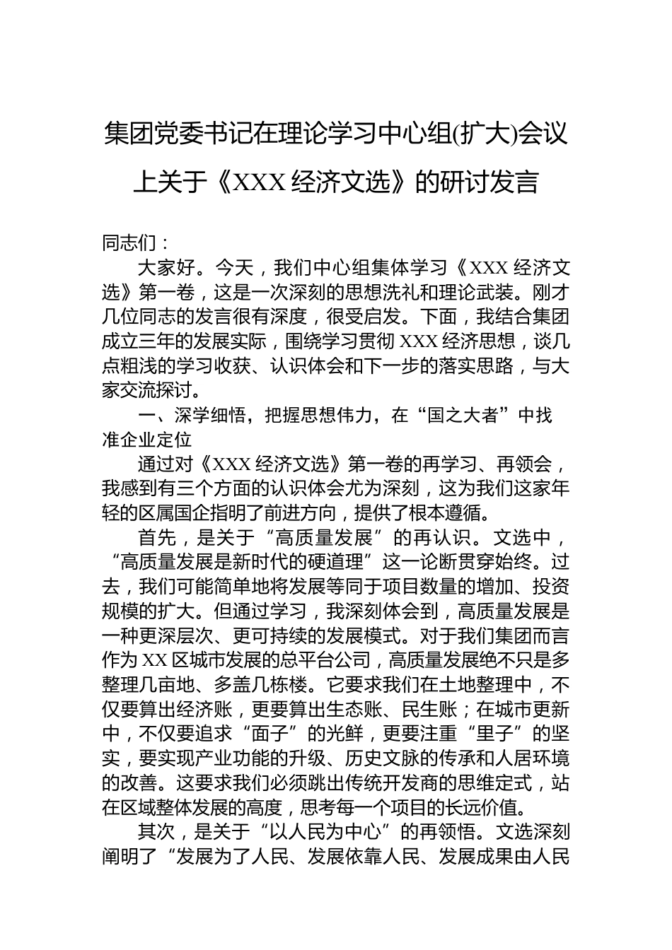 集團黨委書記在理論學習中心組(擴大)會議上關于《XXX經濟文選》的研討發(fā)言同志們:大家好。今天,我們中心組集體學習《XXX經濟文選》第一卷,這是一次深刻的思想洗禮和理論武裝。剛才幾位同志的發(fā)言很有深度,很受啟發(fā)。下面,我結合集團成立三年的發(fā)展實際,圍繞學習貫徹XXX經濟思想,談幾點粗淺的學習收獲、認識體會和下一步的落實思路,與大家交流探討。一、深學細悟,把握思想偉力,在“國之大者”中找準企業(yè)定位通過對《XXX經濟文選》第一卷的再學習、再領會,我感到有三個方面的認識體會尤為深刻,這為我們這家年輕的區(qū)屬國企指明了前進方向,提供了根本遵循。首先...