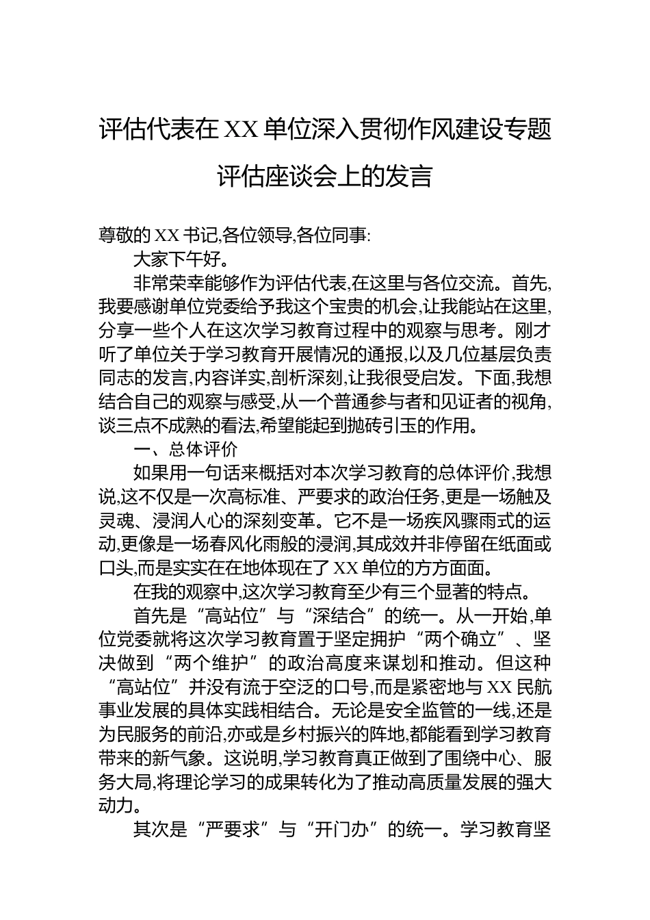 評(píng)估代表在XX單位深入貫徹作風(fēng)建設(shè)專題評(píng)估座談會(huì)上的發(fā)言尊敬的XX書記,各位領(lǐng)導(dǎo),各位同事:大家下午好。非常榮幸能夠作為評(píng)估代表,在這里與各位交流。首先,我要感謝單位黨委給予我這個(gè)寶貴的機(jī)會(huì),讓我能站在這里,分享一些個(gè)人在這次學(xué)習(xí)教育過(guò)程中的觀察與思考。剛才聽了單位關(guān)于學(xué)習(xí)教育開展情況的通報(bào),以及幾位基層負(fù)責(zé)同志的發(fā)言,內(nèi)容詳實(shí),剖析深刻,讓我很受啟發(fā)。下面,我想結(jié)合自己的觀察與感受,從一個(gè)普通參與者和見證者的視角,談三點(diǎn)不成熟的看法,希望能起到拋磚引玉的作用。一、總體評(píng)價(jià)如果用一句話來(lái)概括對(duì)本次學(xué)習(xí)教育的總體評(píng)價(jià),我想說(shuō),這不僅是一次高標(biāo)準(zhǔn)、...