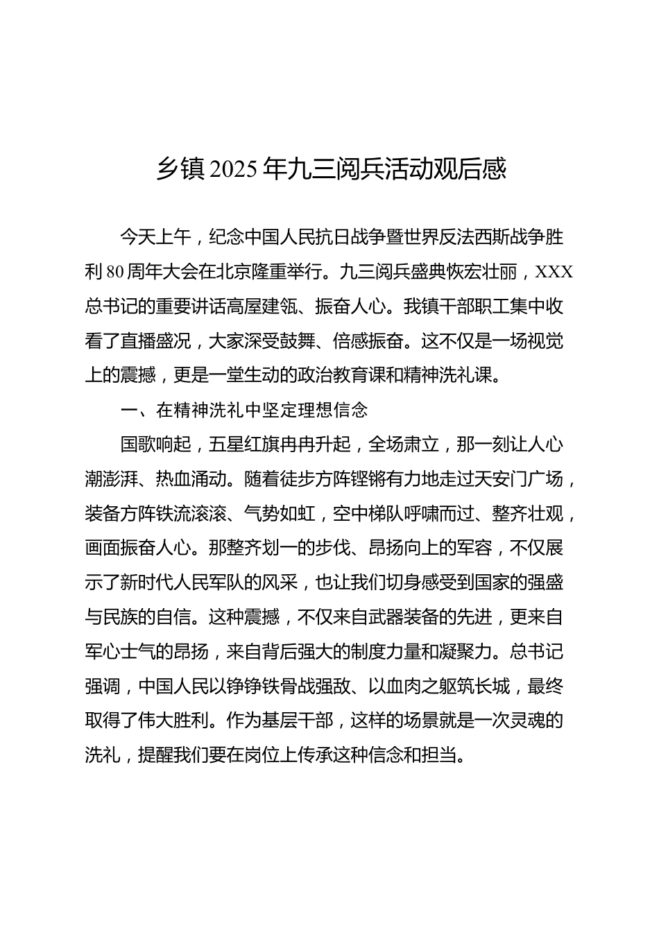 鄉(xiāng)鎮(zhèn)2025年九三閱兵活動觀后感今天上午,紀(jì)念中國人民抗日戰(zhàn)爭暨世界反法西斯戰(zhàn)爭勝利80周年大會在北京隆重舉行。九三閱兵盛典恢宏壯麗,XXX總書記的重要講話高屋建瓴、振奮人心。我鎮(zhèn)干部職工集中收看了直播盛況,大家深受鼓舞、倍感振奮。這不僅是一場視覺上的震撼,更是一堂生動的政治教育課和精神洗禮課。一、在精神洗禮中堅(jiān)定理想信念國歌響起,五星紅旗冉冉升起,全場肅立,那一刻讓人心潮澎湃、熱血涌動。隨著徒步方陣鏗鏘有力地走過天安門廣場,裝備方陣鐵流滾滾、氣勢如虹,空中梯隊(duì)呼嘯而過、整齊壯觀,畫面振奮人心。那整齊劃一的步伐、昂揚(yáng)向上的軍容,不僅...