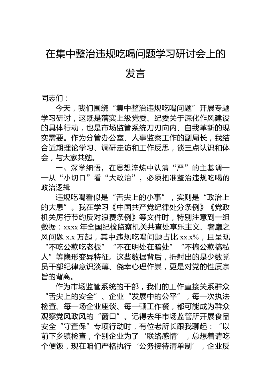 在集中整治違規(guī)吃喝問題學習研討會上的發(fā)言材料匯編(3篇)目錄1.在集中整治違規(guī)吃喝問題學習研討會上的發(fā)言....................22.在集中整治違規(guī)吃喝問題學習研討會上的發(fā)言..................83.在集中整治違規(guī)吃喝問題學習研討會上的發(fā)言................16在集中整治違規(guī)吃喝問題學習研討會上的發(fā)言同志們:今天,我們圍繞“集中整治違規(guī)吃喝問題”開展專題學習研討,這既是落實上級黨委、紀委關于深化作風建設的具體行動,也是市場監(jiān)管系統(tǒng)刀刃向內、自我革新的現實需要。作為分管辦公室、人事監(jiān)察工作的副局長,我結合近期理論學習、調研走訪和工作反思,談三點...