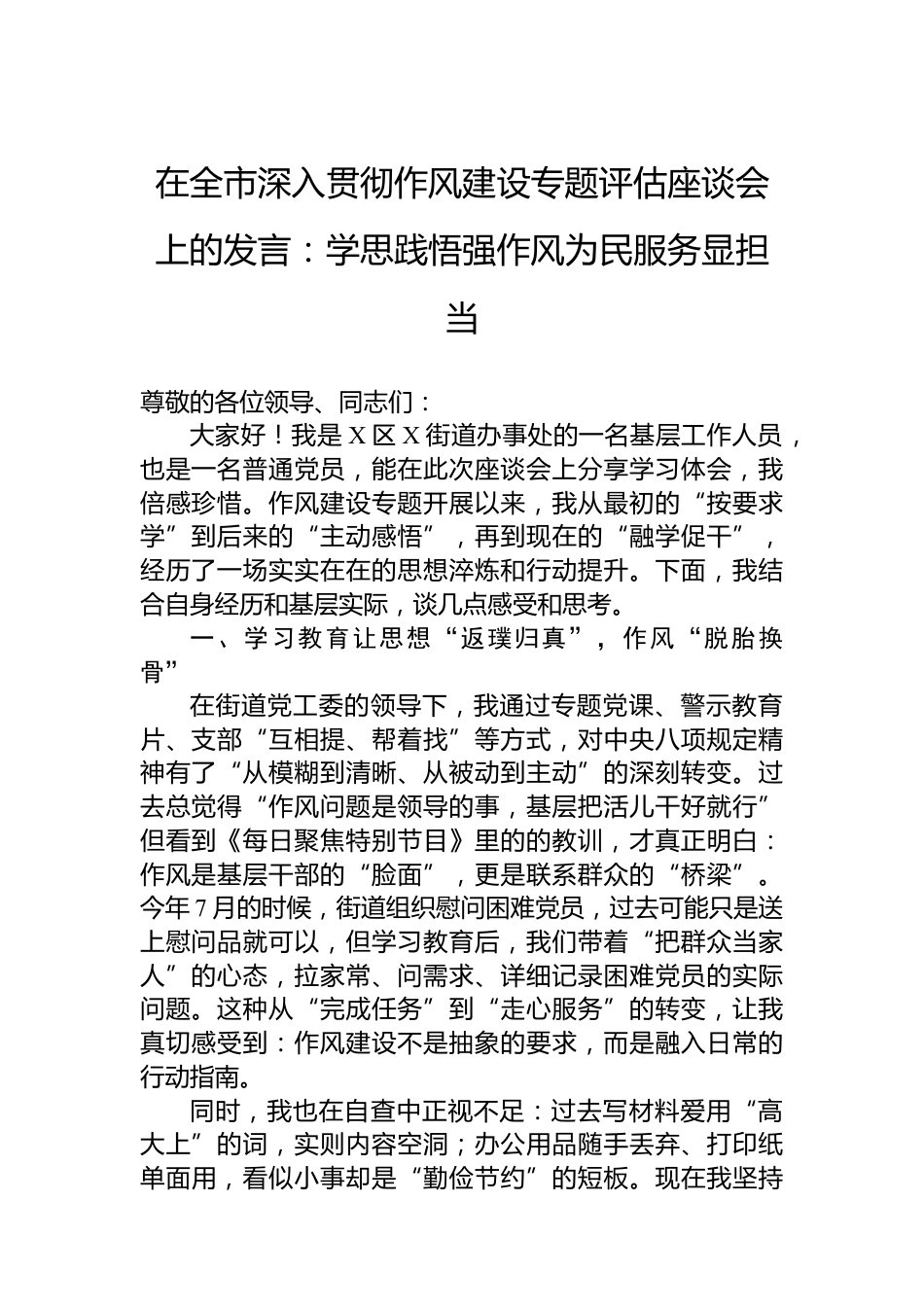 在全市深入貫徹作風(fēng)建設(shè)專題評(píng)估座談會(huì)上的發(fā)言:學(xué)思踐悟強(qiáng)作風(fēng)為民服務(wù)顯擔(dān)當(dāng)尊敬的各位領(lǐng)導(dǎo)、同志們:大家好!我是X區(qū)X街道辦事處的一名基層工作人員,也是一名普通黨員,能在此次座談會(huì)上分享學(xué)習(xí)體會(huì),我倍感珍惜。作風(fēng)建設(shè)專題開(kāi)展以來(lái),我從最初的“按要求學(xué)”到后來(lái)的“主動(dòng)感悟”,再到現(xiàn)在的“融學(xué)促干”,經(jīng)歷了一場(chǎng)實(shí)實(shí)在在的思想淬煉和行動(dòng)提升。下面,我結(jié)合自身經(jīng)歷和基層實(shí)際,談幾點(diǎn)感受和思考。一、學(xué)習(xí)教育讓思想“返璞歸真”,作風(fēng)“脫胎換骨”在街道黨工委的領(lǐng)導(dǎo)下,我通過(guò)專題黨課、警示教育片、支部“互相提、幫著找”等方式,對(duì)中央八項(xiàng)規(guī)定精神...