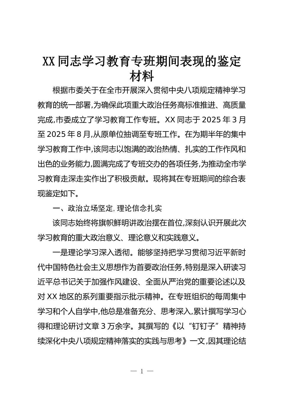 XX同志學(xué)習(xí)教育專班期間表現(xiàn)的鑒定材料根據(jù)市委關(guān)于在全市開展深入貫徹中央八項(xiàng)規(guī)定精神學(xué)習(xí)教育的統(tǒng)一部署,為確保此項(xiàng)重大政治任務(wù)高標(biāo)準(zhǔn)推進(jìn)、高質(zhì)量完成,市委成立了學(xué)習(xí)教育工作專班。XX同志于2025年3月至2025年8月,從原單位抽調(diào)至專班工作。在為期半年的集中學(xué)習(xí)教育工作中,該同志以飽滿的政治熱情、扎實(shí)的工作作風(fēng)和出色的業(yè)務(wù)能力,圓滿完成了專班交辦的各項(xiàng)任務(wù),為推動(dòng)全市學(xué)習(xí)教育走深走實(shí)作出了積極貢獻(xiàn)?,F(xiàn)將其在專班期間的綜合表現(xiàn)鑒定如下。一、政治立場(chǎng)堅(jiān)定,理論信念扎實(shí)該同志始終將旗幟鮮明講政治擺在首位,深刻認(rèn)識(shí)開展此次學(xué)習(xí)教育的重大政治意義、理論意...