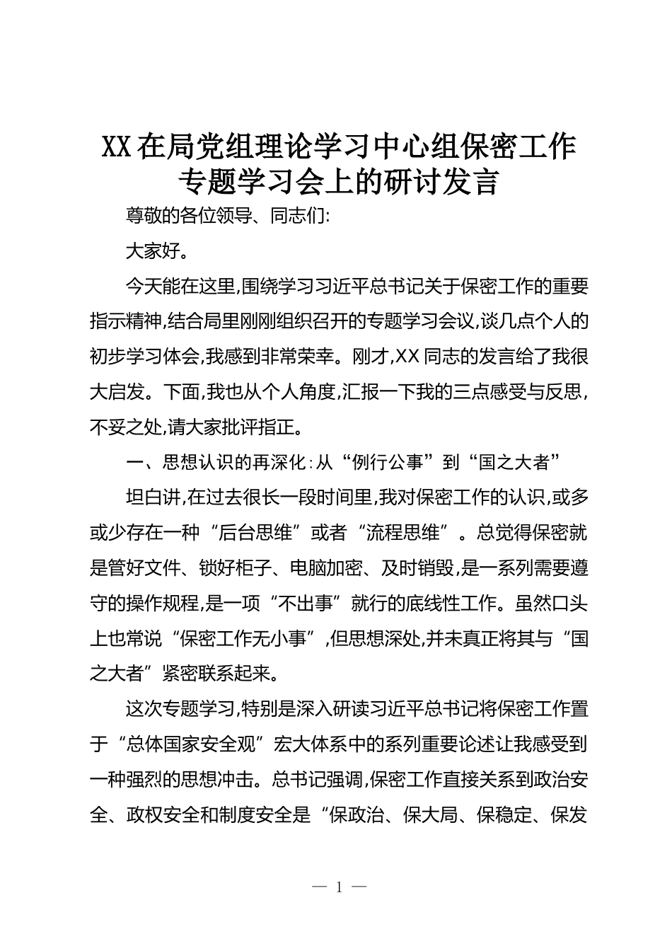 XX在局黨組理論學(xué)習(xí)中心組保密工作專題學(xué)習(xí)會上的研討發(fā)言尊敬的各位領(lǐng)導(dǎo)、同志們:大家好。今天能在這里,圍繞學(xué)習(xí)習(xí)近平總書記關(guān)于保密工作的重要指示精神,結(jié)合局里剛剛組織召開的專題學(xué)習(xí)會議,談幾點(diǎn)個人的初步學(xué)習(xí)體會,我感到非常榮幸。剛才,XX同志的發(fā)言給了我很大啟發(fā)。下面,我也從個人角度,匯報(bào)一下我的三點(diǎn)感受與反思,不妥之處,請大家批評指正。一、思想認(rèn)識的再深化:從“例行公事”到“國之大者”坦白講,在過去很長一段時間里,我對保密工作的認(rèn)識,或多或少存在一種“后臺思維”或者“流程思維”。總覺得保密就是管好文件、鎖好柜子、電腦加密、及時銷毀,是一系列...