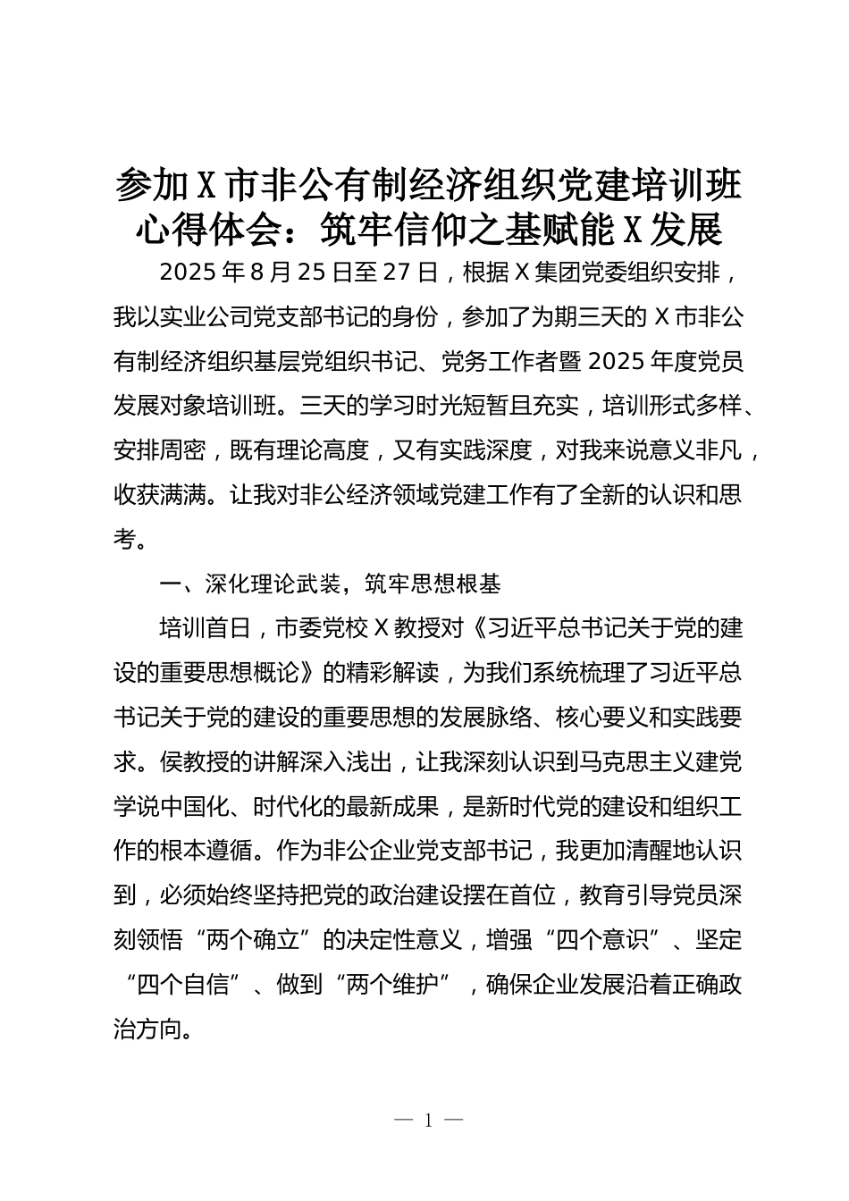 參加X市非公有制經(jīng)濟(jì)組織黨建培訓(xùn)班心得體會:筑牢信仰之基賦能X發(fā)展2025年8月25日至27日,根據(jù)X集團(tuán)黨委組織安排,我以實業(yè)公司黨支部書記的身份,參加了為期三天的X市非公有制經(jīng)濟(jì)組織基層黨組織書記、黨務(wù)工作者暨2025年度黨員發(fā)展對象培訓(xùn)班。三天的學(xué)習(xí)時光短暫且充實,培訓(xùn)形式多樣、安排周密,既有理論高度,又有實踐深度,對我來說意義非凡,收獲滿滿。讓我對非公經(jīng)濟(jì)領(lǐng)域黨建工作有了全新的認(rèn)識和思考。一、深化理論武裝,筑牢思想根基培訓(xùn)首日,市委黨校X教授對《習(xí)近平總書記關(guān)于黨的建設(shè)的重要思想概論》的精彩解讀,為我們系統(tǒng)梳理了習(xí)近平總書記關(guān)于黨的建...
