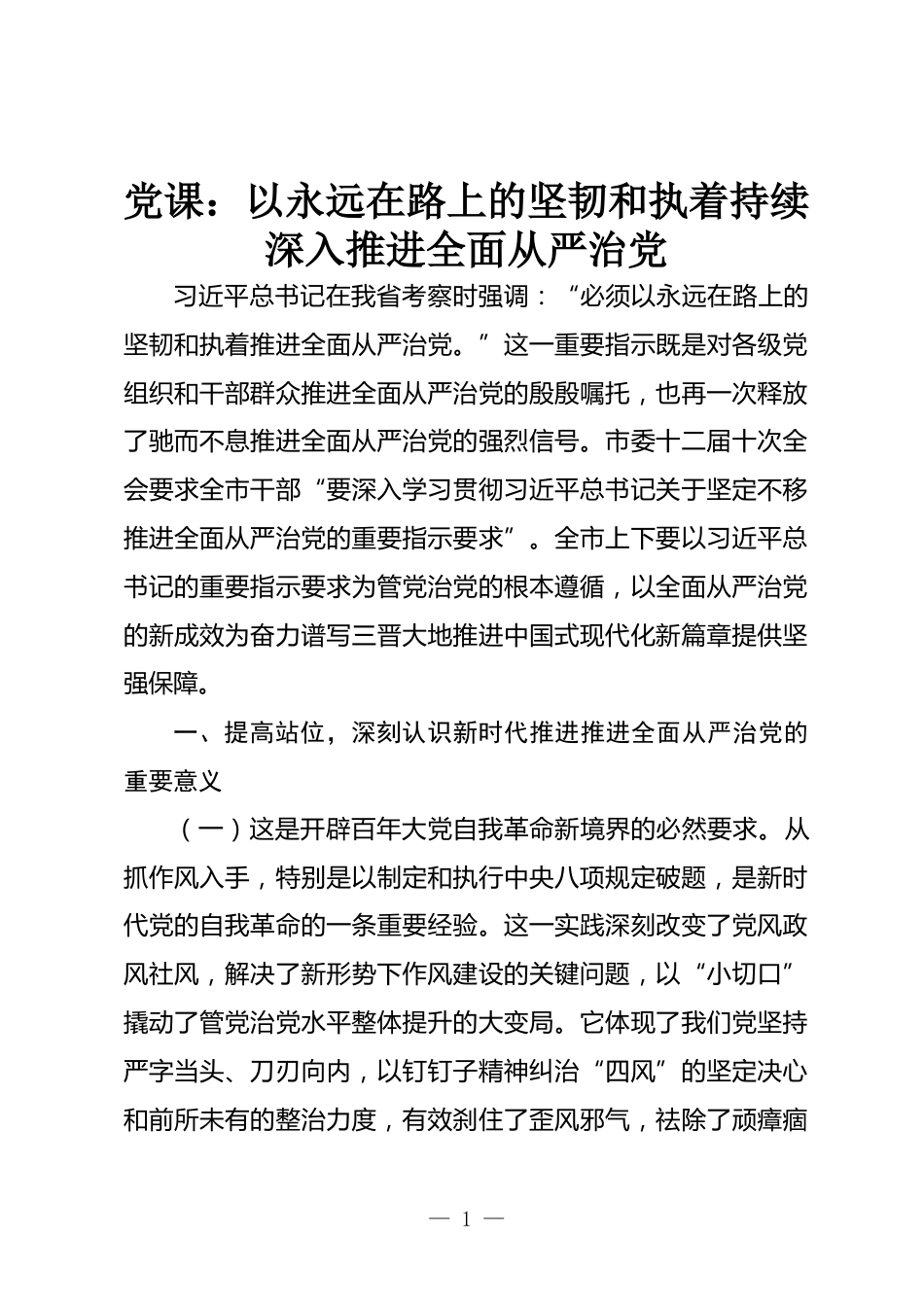 黨課:以永遠在路上的堅韌和執(zhí)著持續(xù)深入推進全面從嚴治黨VIP免費