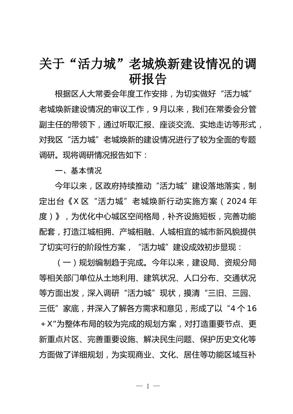 關于“活力城”老城煥新建設情況的調研報告根據(jù)區(qū)人大常委會年度工作安排,為切實做好“活力城”老城煥新建設情況的審議工作,9月以來,我們在常委會分管副主任的帶領下,通過聽取匯報、座談交流、實地走訪等形式,對我區(qū)“活力城”老城煥新的建設情況進行了較為全面的專題調研?,F(xiàn)將調研情況報告如下:一、基本情況今年以來,區(qū)政府持續(xù)推動“活力城”建設落地落實,制定出臺《X區(qū)“活力城”老城煥新行動實施方案(2024年度)》,為優(yōu)化中心城區(qū)空間格局,補齊設施短板,完善功能配套,打造江城相擁、產城相融、人城相宜的城市新風貌提供了切實可行的階段性方案,“活力...