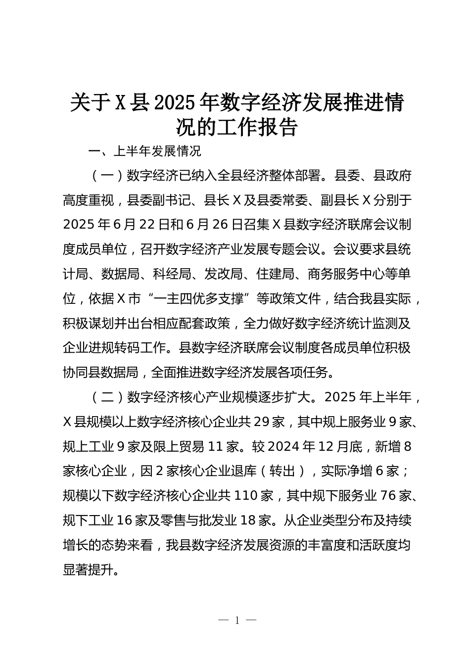關(guān)于X縣2025年數(shù)字經(jīng)濟(jì)發(fā)展推進(jìn)情況的工作報(bào)告