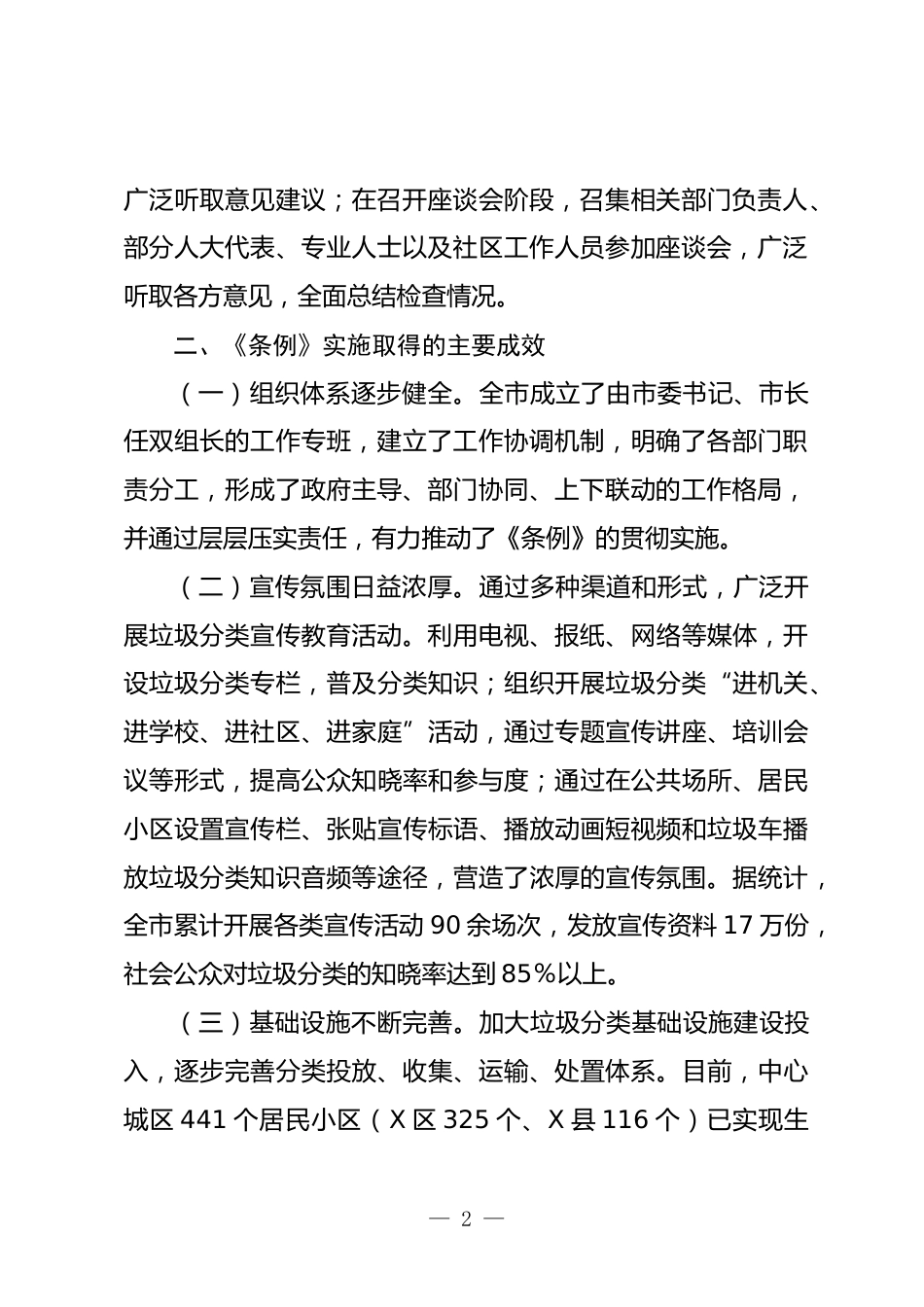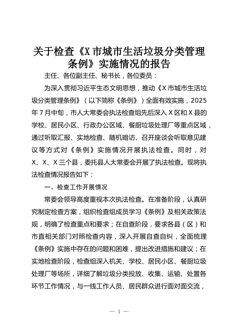 關(guān)于檢查《X市城市生活垃圾分類管理?xiàng)l例》實(shí)施情況的報(bào)告主任、各位副主任、秘書(shū)長(zhǎng),各位委員:為深入貫徹習(xí)近平生態(tài)文明思想,推動(dòng)《X市城市生活垃圾分類管理?xiàng)l例》(以下簡(jiǎn)稱《條例》)全面有效實(shí)施,2025年7月中旬,市人大常委會(huì)執(zhí)法檢查組先后深入X區(qū)和X縣的學(xué)校、居民小區(qū)、行政辦公區(qū)域、餐廚垃圾處理廠等重點(diǎn)區(qū)域,通過(guò)聽(tīng)取匯報(bào)、實(shí)地檢查、隨機(jī)暗訪、召開(kāi)座談會(huì)聽(tīng)取意見(jiàn)建議等方式對(duì)《條例》實(shí)施情況開(kāi)展執(zhí)法檢查。同時(shí),對(duì)X、X、X三個(gè)縣,委托縣人大常委會(huì)開(kāi)展了執(zhí)法檢查?,F(xiàn)將執(zhí)法檢查情況報(bào)告如下:一、檢查工作開(kāi)展情況常委會(huì)領(lǐng)導(dǎo)高度重視本次執(zhí)法檢查。在準(zhǔn)...
