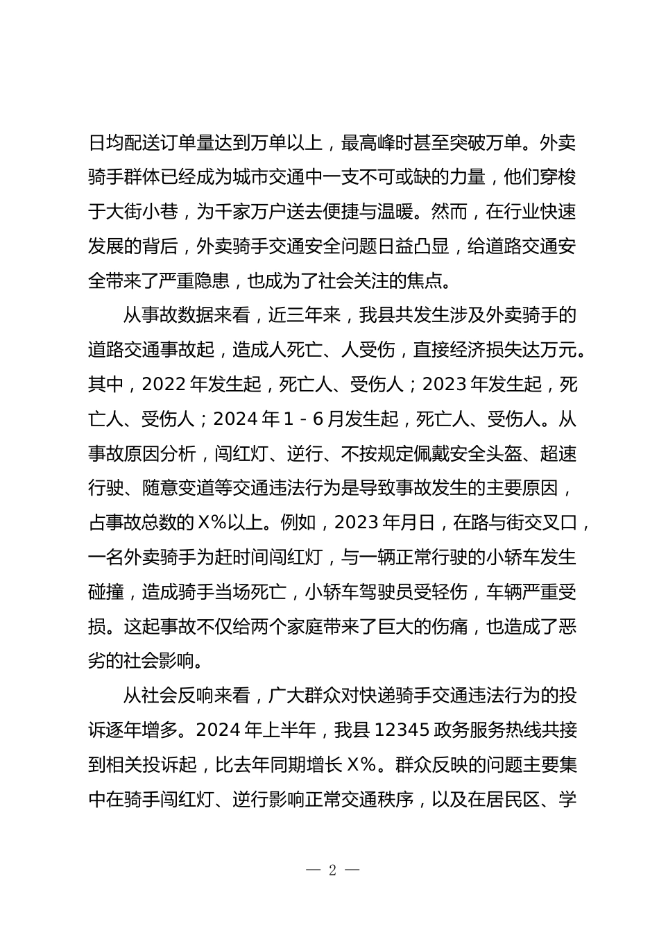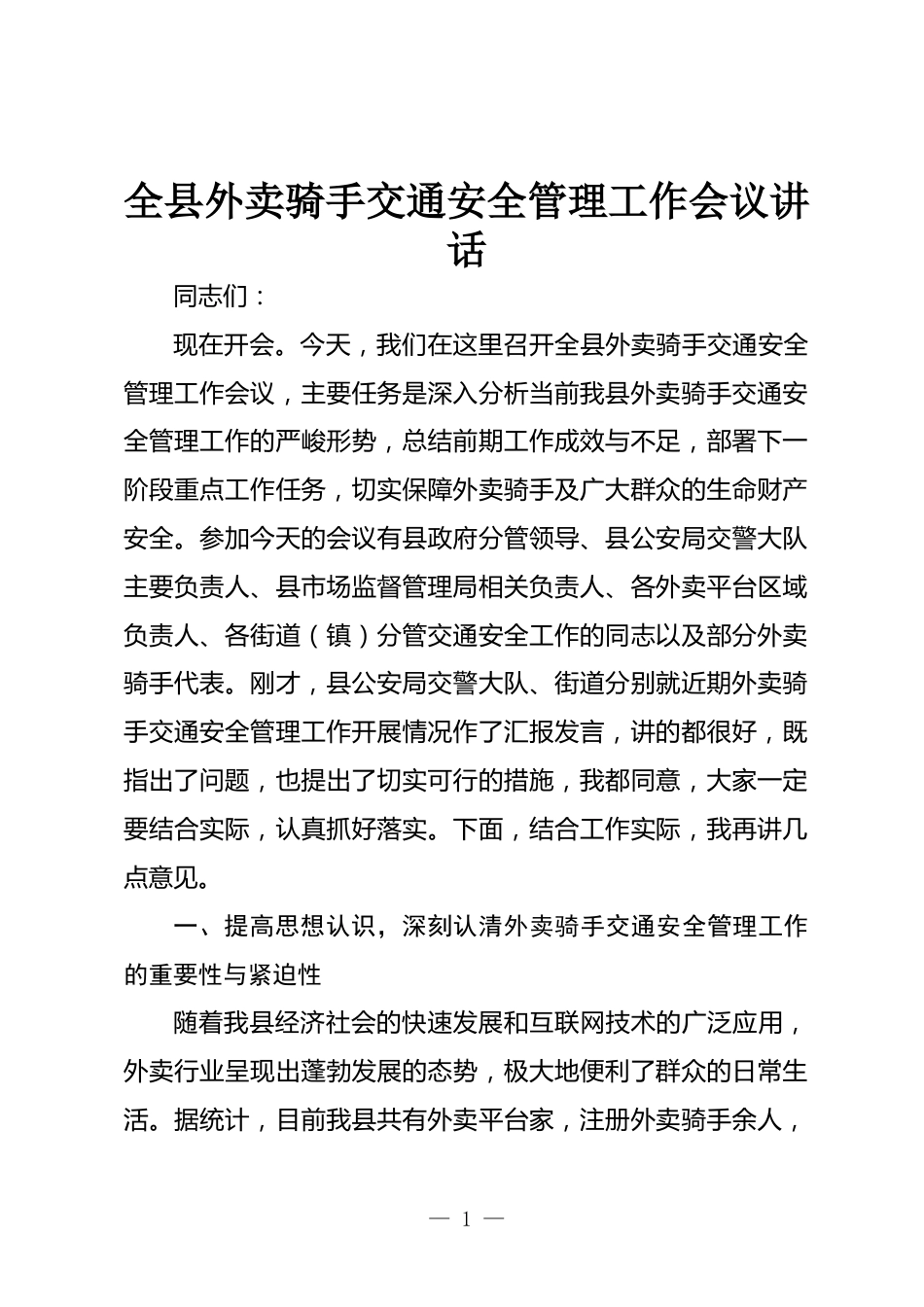 全縣外賣騎手交通安全管理工作會議講話同志們:現(xiàn)在開會。今天,我們在這里召開全縣外賣騎手交通安全管理工作會議,主要任務(wù)是深入分析當(dāng)前我縣外賣騎手交通安全管理工作的嚴(yán)峻形勢,總結(jié)前期工作成效與不足,部署下一階段重點(diǎn)工作任務(wù),切實保障外賣騎手及廣大群眾的生命財產(chǎn)安全。參加今天的會議有縣政府分管領(lǐng)導(dǎo)、縣公安局交警大隊主要負(fù)責(zé)人、縣市場監(jiān)督管理局相關(guān)負(fù)責(zé)人、各外賣平臺區(qū)域負(fù)責(zé)人、各街道(鎮(zhèn))分管交通安全工作的同志以及部分外賣騎手代表。剛才,縣公安局交警大隊、街道分別就近期外賣騎手交通安全管理工作開展情況作了匯報發(fā)言,講的都很好,既指出...