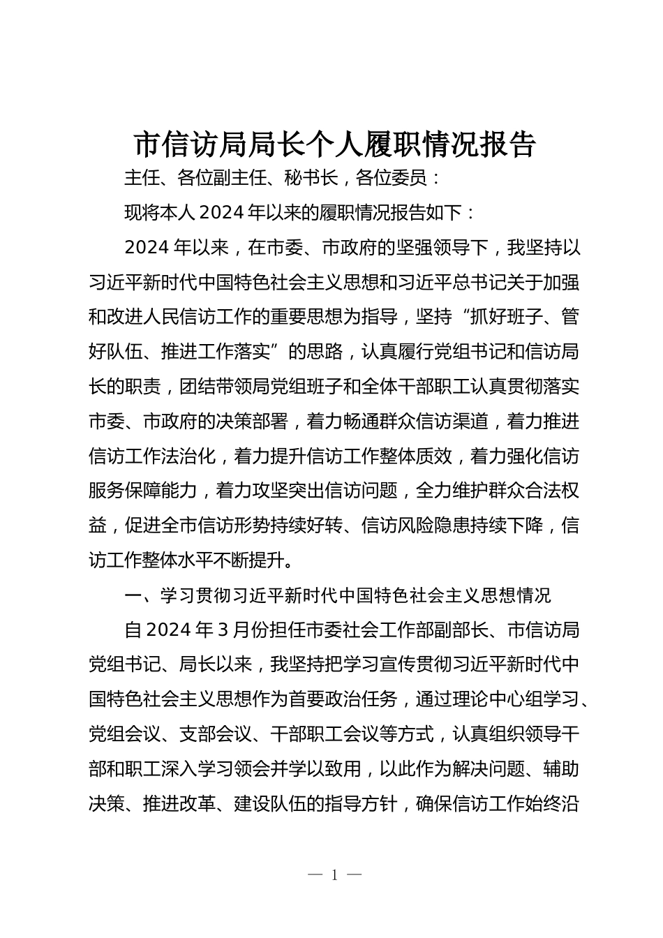 市信訪局局長(zhǎng)個(gè)人履職情況報(bào)告主任、各位副主任、秘書長(zhǎng),各位委員:現(xiàn)將本人2024年以來(lái)的履職情況報(bào)告如下:2024年以來(lái),在市委、市政府的堅(jiān)強(qiáng)領(lǐng)導(dǎo)下,我堅(jiān)持以習(xí)近平新時(shí)代中國(guó)特色社會(huì)主義思想和習(xí)近平總書記關(guān)于加強(qiáng)和改進(jìn)人民信訪工作的重要思想為指導(dǎo),堅(jiān)持“抓好班子、管好隊(duì)伍、推進(jìn)工作落實(shí)”的思路,認(rèn)真履行黨組書記和信訪局長(zhǎng)的職責(zé),團(tuán)結(jié)帶領(lǐng)局黨組班子和全體干部職工認(rèn)真貫徹落實(shí)市委、市政府的決策部署,著力暢通群眾信訪渠道,著力推進(jìn)信訪工作法治化,著力提升信訪工作整體質(zhì)效,著力強(qiáng)化信訪服務(wù)保障能力,著力攻堅(jiān)突出信訪問(wèn)題,全力維護(hù)群眾合法權(quán)益...