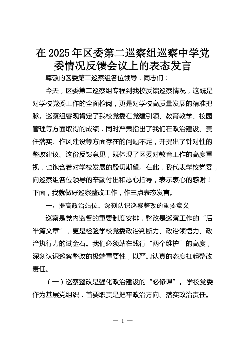 在2025年區(qū)委第二巡察組巡察中學黨委情況反饋會議上的表態(tài)發(fā)言