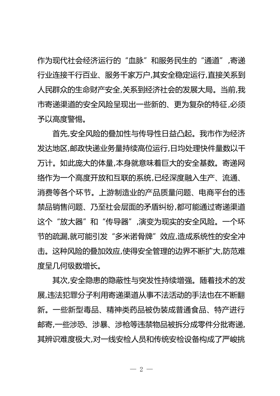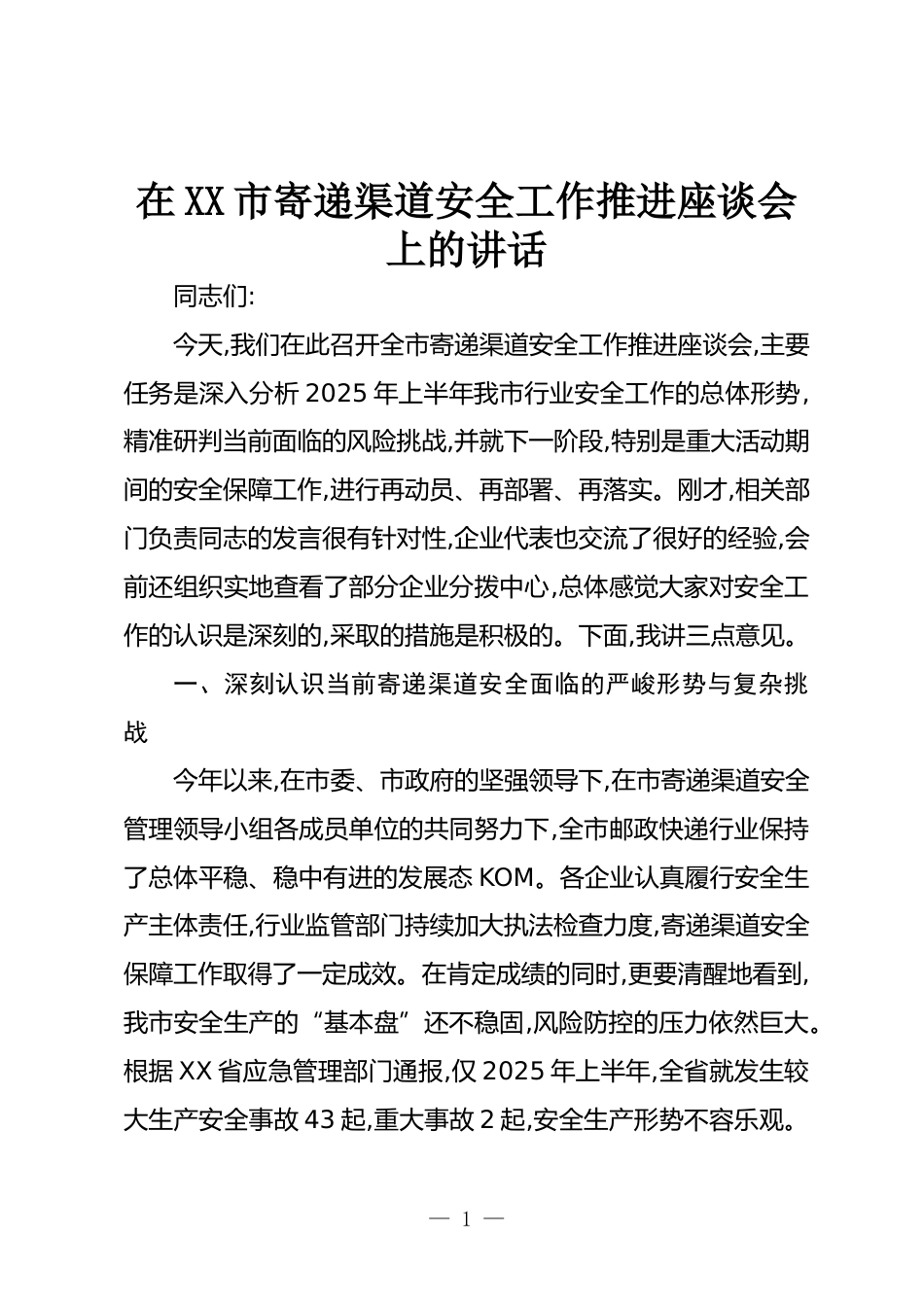 在XX市寄遞渠道安全工作推進座談會上的講話同志們:今天,我們在此召開全市寄遞渠道安全工作推進座談會,主要任務(wù)是深入分析2025年上半年我市行業(yè)安全工作的總體形勢,精準研判當前面臨的風險挑戰(zhàn),并就下一階段,特別是重大活動期間的安全保障工作,進行再動員、再部署、再落實。剛才,相關(guān)部門負責同志的發(fā)言很有針對性,企業(yè)代表也交流了很好的經(jīng)驗,會前還組織實地查看了部分企業(yè)分撥中心,總體感覺大家對安全工作的認識是深刻的,采取的措施是積極的。下面,我講三點意見。一、深刻認識當前寄遞渠道安全面臨的嚴峻形勢與復(fù)雜挑戰(zhàn)今年以來,在市委、市政府的堅強領(lǐng)導(dǎo)下,在市寄遞渠...