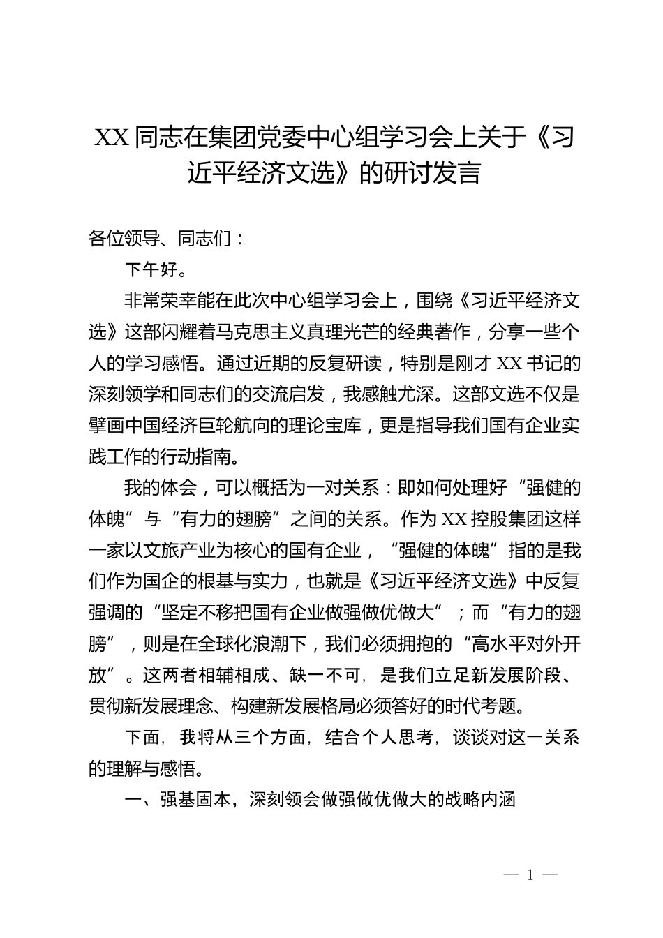 XX同志在集團(tuán)黨委中心組學(xué)習(xí)會上關(guān)于《習(xí)近平經(jīng)濟(jì)文選》的研討發(fā)言