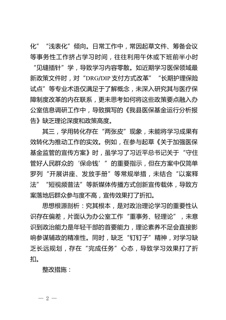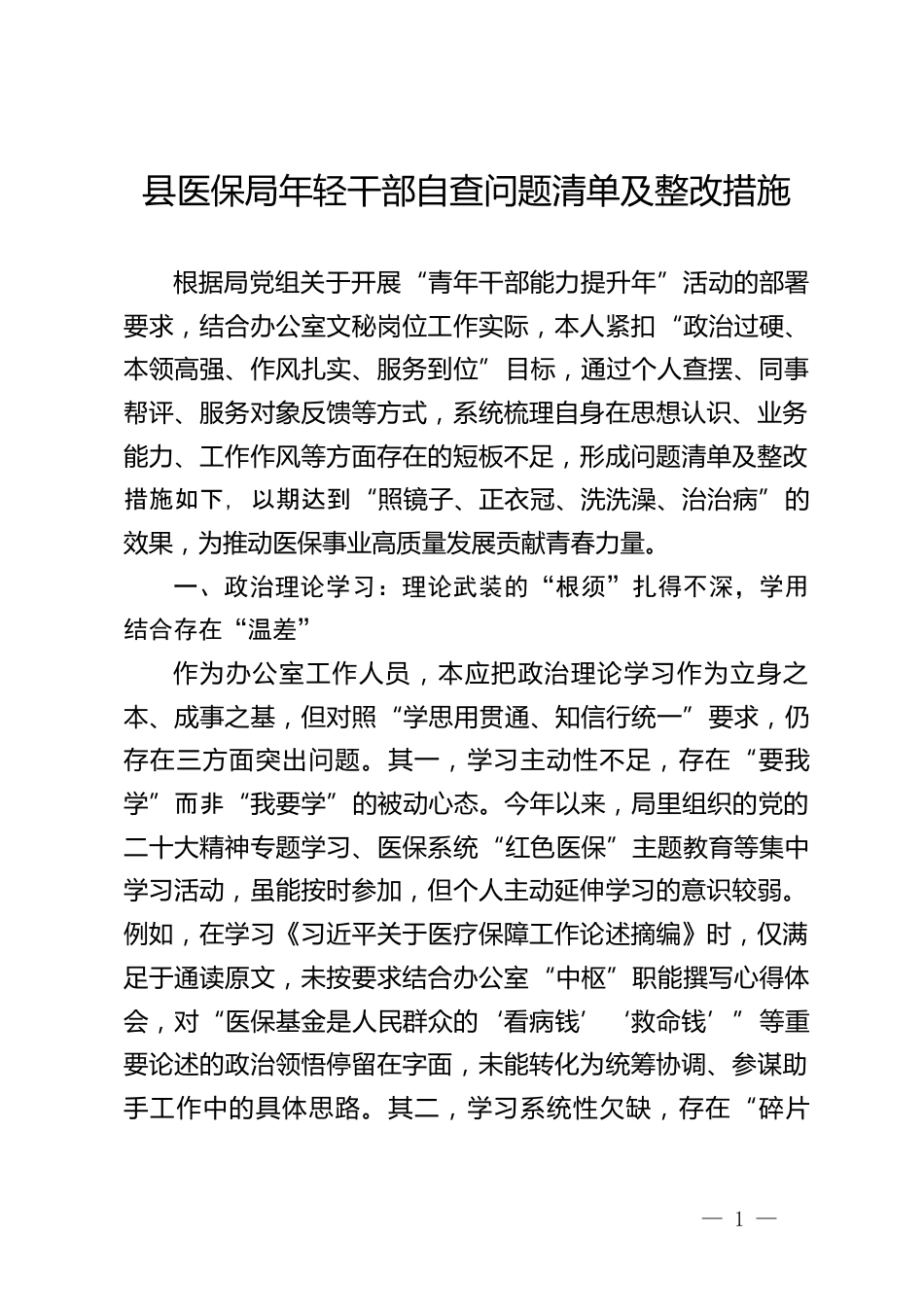 縣醫(yī)保局年輕干部自查問(wèn)題清單及整改措施根據(jù)局黨組關(guān)于開(kāi)展“青年干部能力提升年”活動(dòng)的部署要求,結(jié)合辦公室文秘崗位工作實(shí)際,本人緊扣“政治過(guò)硬、本領(lǐng)高強(qiáng)、作風(fēng)扎實(shí)、服務(wù)到位”目標(biāo),通過(guò)個(gè)人查擺、同事幫評(píng)、服務(wù)對(duì)象反饋等方式,系統(tǒng)梳理自身在思想認(rèn)識(shí)、業(yè)務(wù)能力、工作作風(fēng)等方面存在的短板不足,形成問(wèn)題清單及整改措施如下,以期達(dá)到“照鏡子、正衣冠、洗洗澡、治治病”的效果,為推動(dòng)醫(yī)保事業(yè)高質(zhì)量發(fā)展貢獻(xiàn)青春力量。一、政治理論學(xué)習(xí):理論武裝的“根須”扎得不深,學(xué)用結(jié)合存在“溫差”作為辦公室工作人員,本應(yīng)把政治理論學(xué)習(xí)作為立身之本、成事之基,...