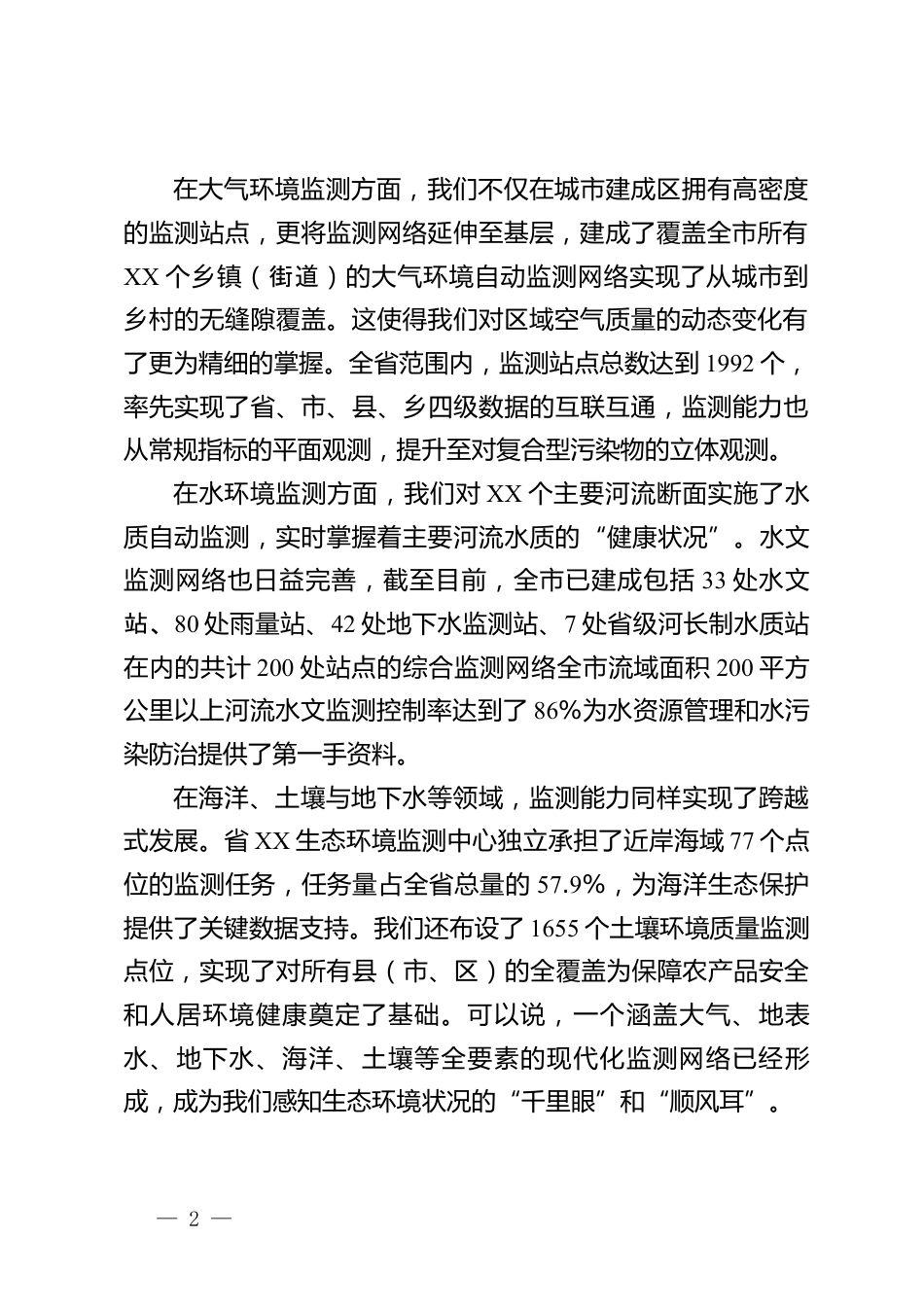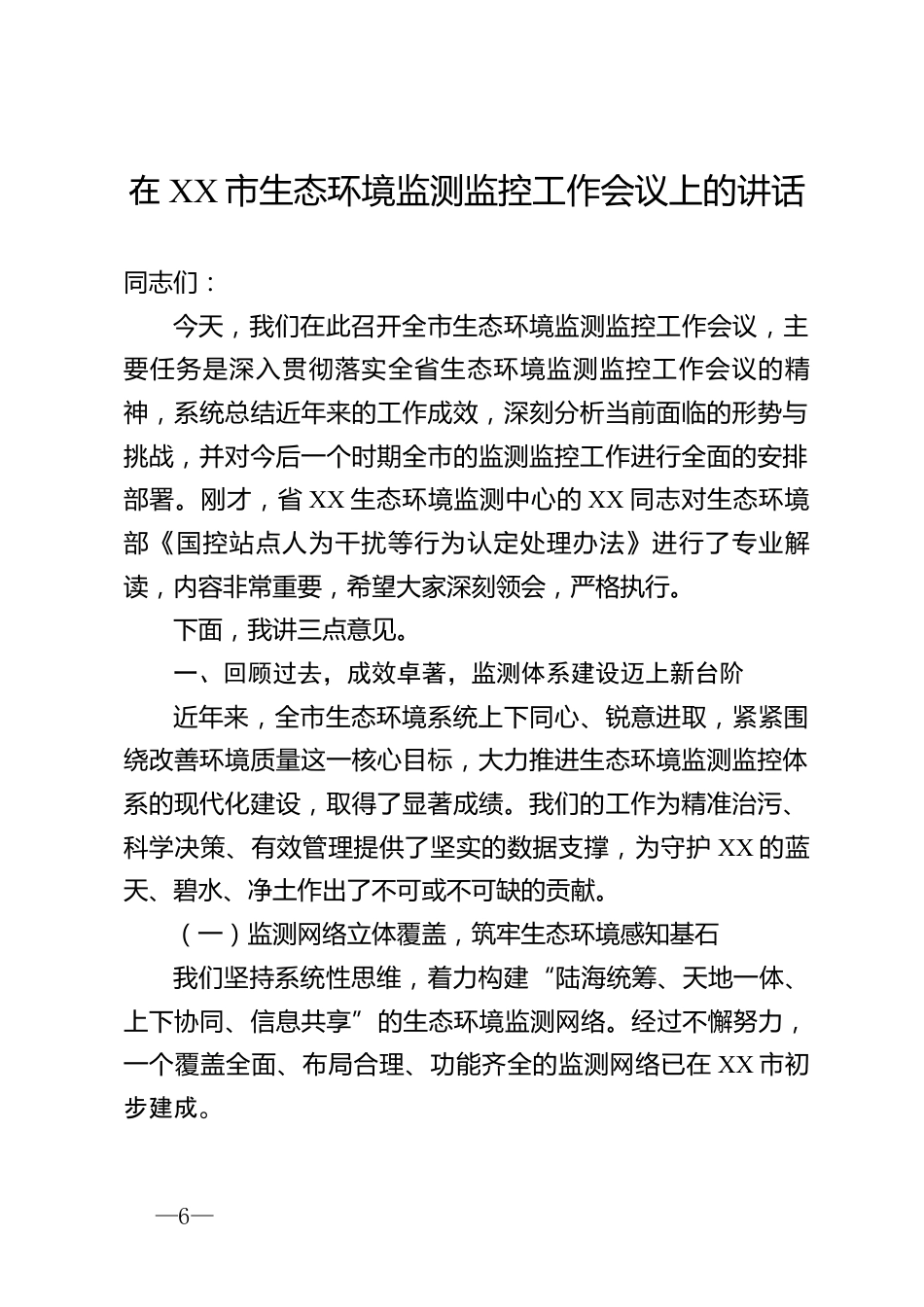 在XX市生態(tài)環(huán)境監(jiān)測監(jiān)控工作會(huì)議上的講話同志們:今天,我們在此召開全市生態(tài)環(huán)境監(jiān)測監(jiān)控工作會(huì)議,主要任務(wù)是深入貫徹落實(shí)全省生態(tài)環(huán)境監(jiān)測監(jiān)控工作會(huì)議的精神,系統(tǒng)總結(jié)近年來的工作成效,深刻分析當(dāng)前面臨的形勢與挑戰(zhàn),并對今后一個(gè)時(shí)期全市的監(jiān)測監(jiān)控工作進(jìn)行全面的安排部署。剛才,省XX生態(tài)環(huán)境監(jiān)測中心的XX同志對生態(tài)環(huán)境部《國控站點(diǎn)人為干擾等行為認(rèn)定處理辦法》進(jìn)行了專業(yè)解讀,內(nèi)容非常重要,希望大家深刻領(lǐng)會(huì),嚴(yán)格執(zhí)行。下面,我講三點(diǎn)意見。一、回顧過去,成效卓著,監(jiān)測體系建設(shè)邁上新臺階近年來,全市生態(tài)環(huán)境系統(tǒng)上下同心、銳意進(jìn)取,緊緊圍繞改善環(huán)境...