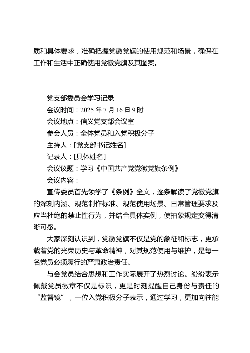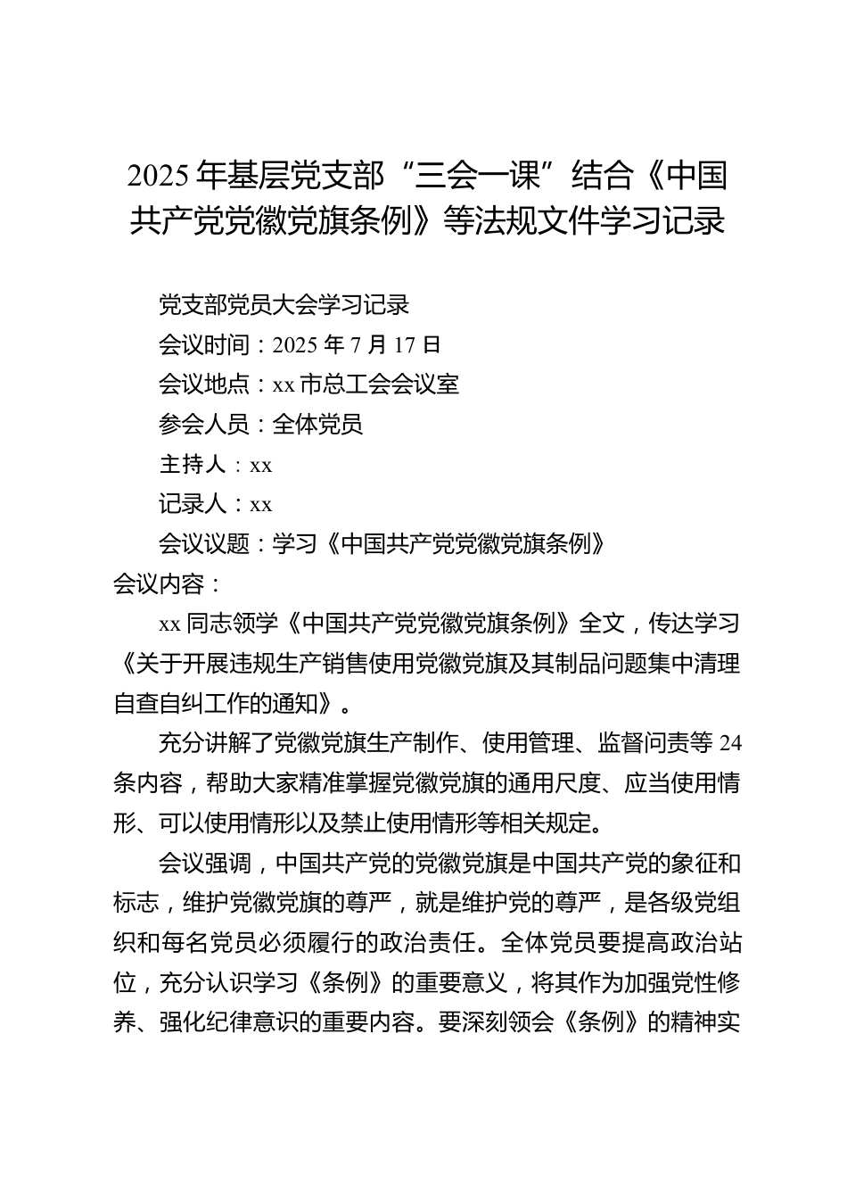 2025年基層黨支部“三會一課”結(jié)合《中國共產(chǎn)黨黨徽黨旗條例》等法規(guī)文件學(xué)習(xí)記錄+2025年7月“三會一課”參考方案